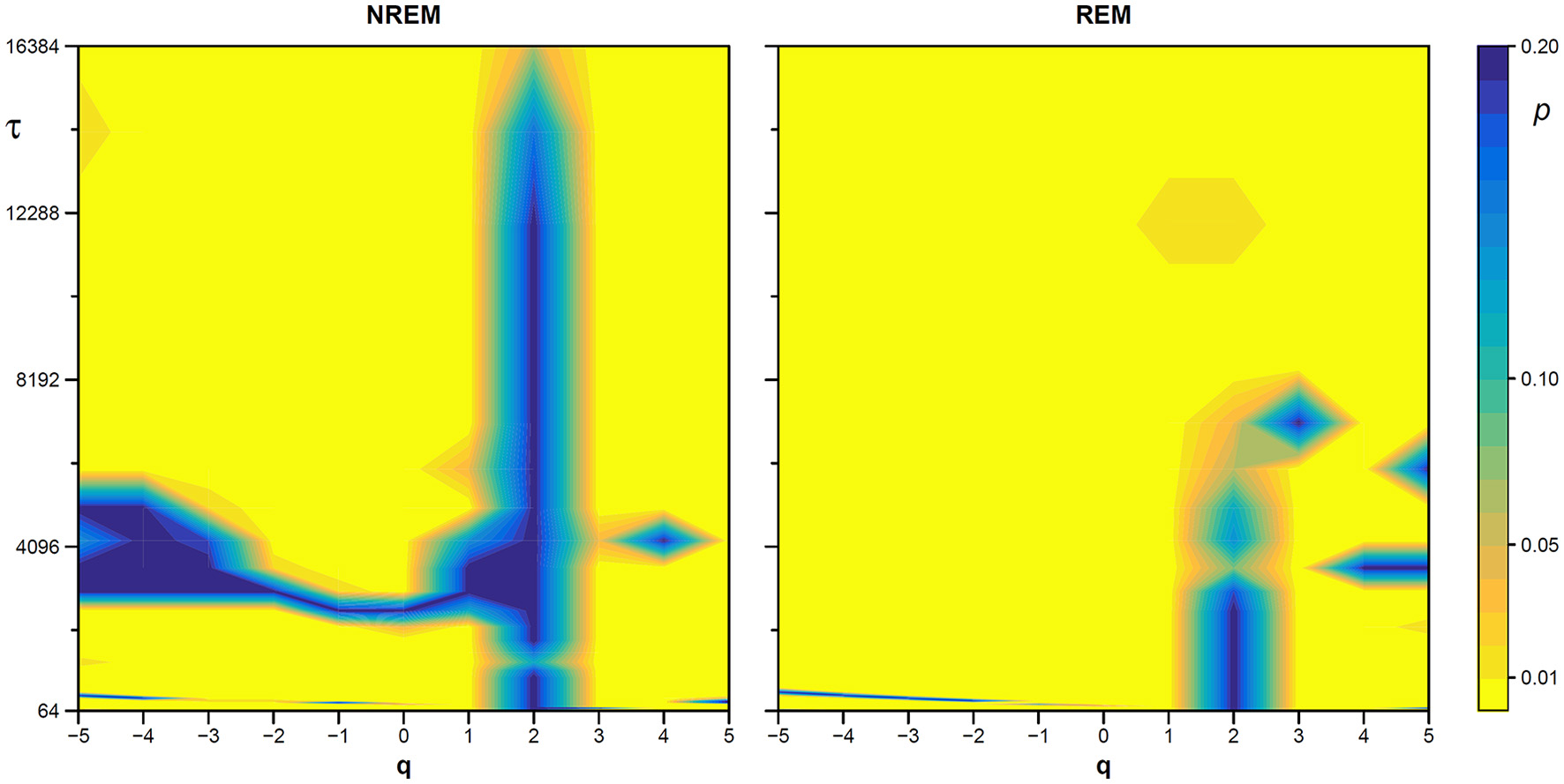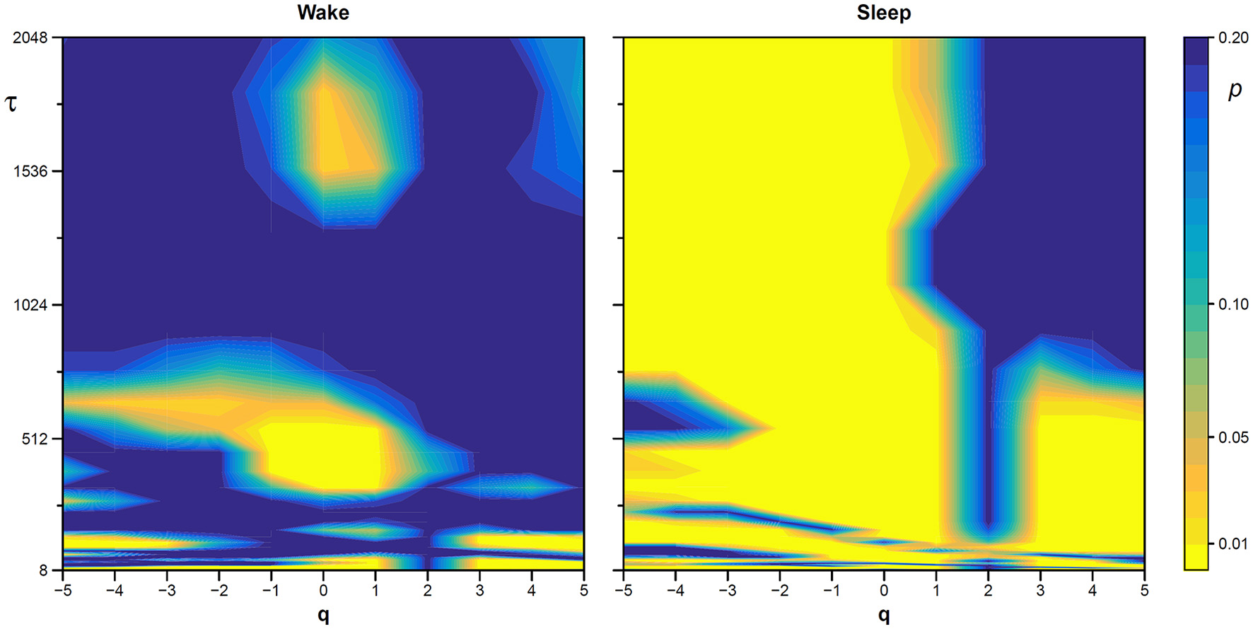 The statistical significance of the difference between the original and surrogate series was assessed evaluating in which percentile of the surrogate dataset the α(q,τ) coefficients of the original series fall. Figure 10 plots the significance p at each scale and moment order. The figure demonstrates the presence of a multifractal dynamics that does not depend on the linear characteristics of the power spectrum, and which characterizes Sleep more than Wake. The whole surrogate analysis of the 200 phase-shuffled series took less than 10 min with our algorithm, while the traditional algorithm would take more than 18 h according to Figure 4.