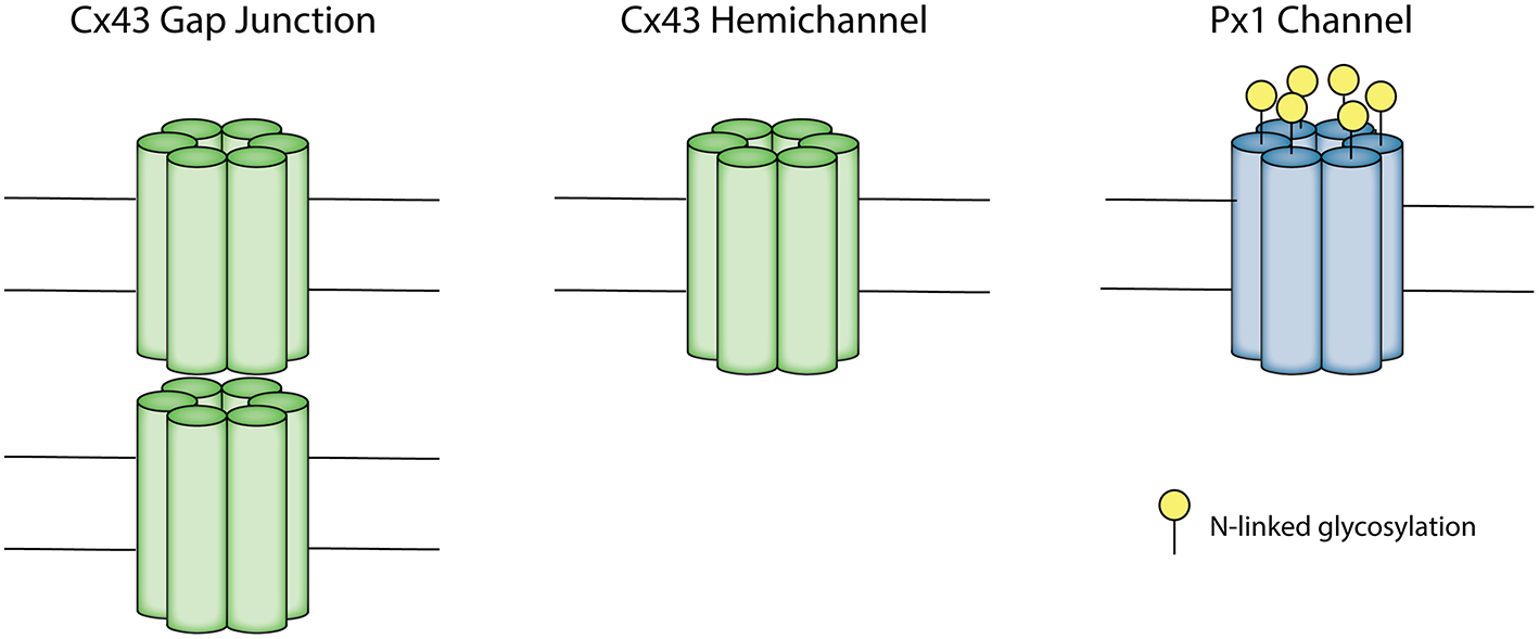 Schematic depicting the Connexin 43 (Cx43) gap junction and hemichannel and pannexin 1 (Px1) channel. A connexon consists of six connexin subunits. A Cx43 gap junction is made up of two opposing connexons, each contributed from two adjacent cells. A Cx43 hemichannel is an unopposed connexon. A Px1 channel is formed by six pannexin subunits. Px1 does not form gap junctions due to N-linked glycosylation on the extracellular loop.