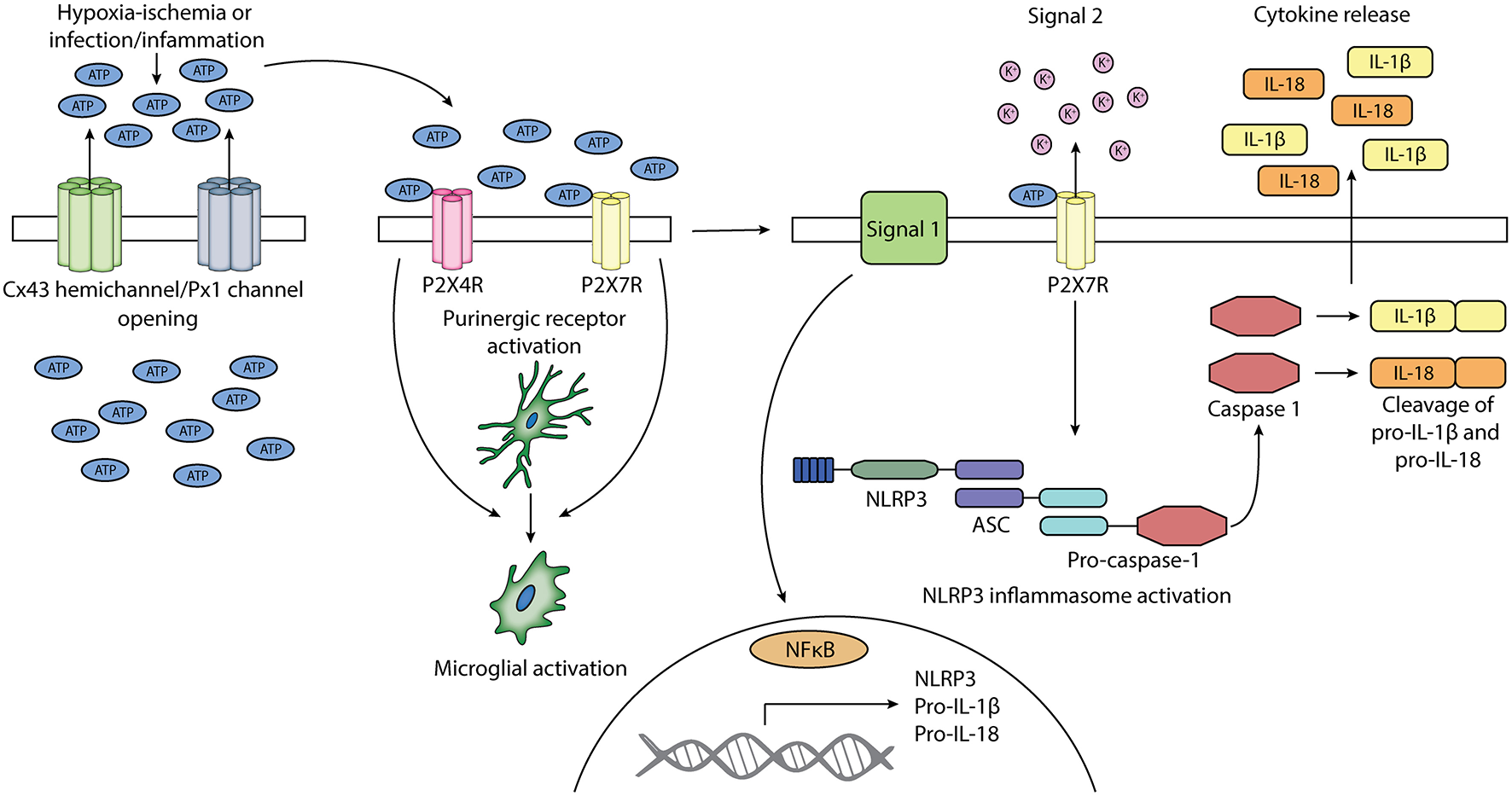 An inflammatory response is seen in perinatal brain injury after HI as well as infection/inflammation, and if chronic inflammation is established can have deleterious effects (Hagberg et al., 2015; Bennet et al., 2018). Hemichannels release adenosine triphosphate (ATP) (Kang et al., 2008; Chekeni et al., 2010; Orellana et al., 2011; Bennett et al., 2012), which may act as a damage associated molecular pattern (DAMP), but is also a key inflammasome activator signal. The release of ATP through connexin hemichannels can perpetuate inflammation through purinergic signaling (Pedata et al., 2016). Purinergic signaling has been associated with the activation of microglia (Li et al., 2011; Kaiser et al., 2016) and the inflammasome complex—a multi-protein complex involved in initiating an innate immune system inflammatory response (Feng et al., 2015). This review will dissect the evidence for these pathways downstream of connexin hemichannel and pannexin channel opening and how they contribute to inflammation. One other membrane pore forming protein, Gasdermin D, has been implicated in the inflammasome pathway (Groslambert and Py, 2018; Kerur et al., 2018), but that channel is very small in comparison with the pannexin and connexin channels and appears to be primarily associated with apoptosis. As will become evident in this review, both in vitro and animal studies using connexin hemichannel or pannexin channel blockers, would suggest that other channels are likely to play minor roles in relation to ATP release, and inflammasome activation in particular.