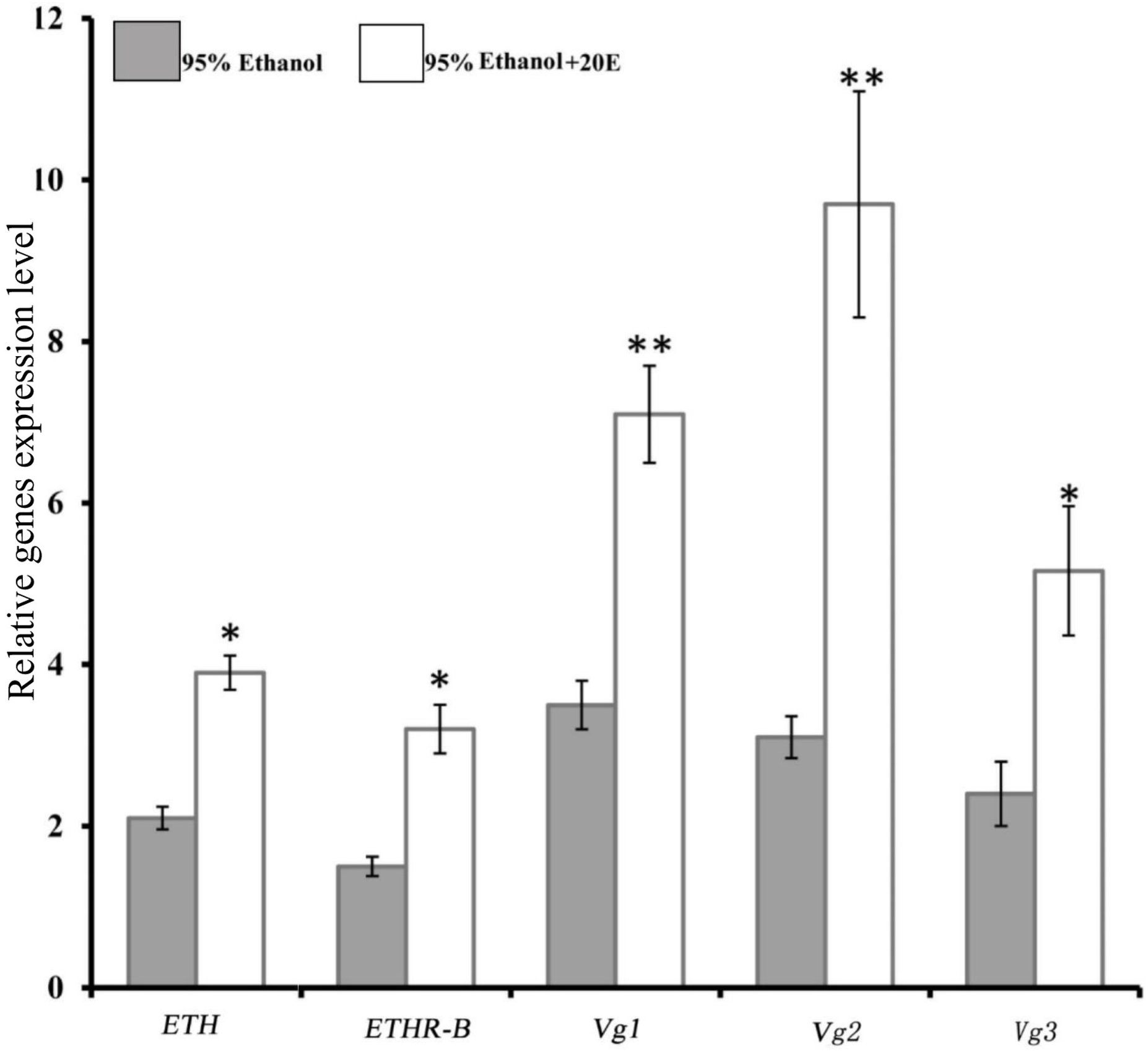 Figure 3. Induce of 20E signaling affect the expression of BdETH, BdETHR-B, Vg1, Vg2, and Vg3 genes. Fold change in expression at 8 h after 20E injection measured by RT-qPCR in female adult of B. dorsalis. Data are means ± SD. Asterisks indicate significant differences with relative expression (∗P < 0.05; ∗∗P < 0.01). BdETHR-A was absent as the Ct values were >33.