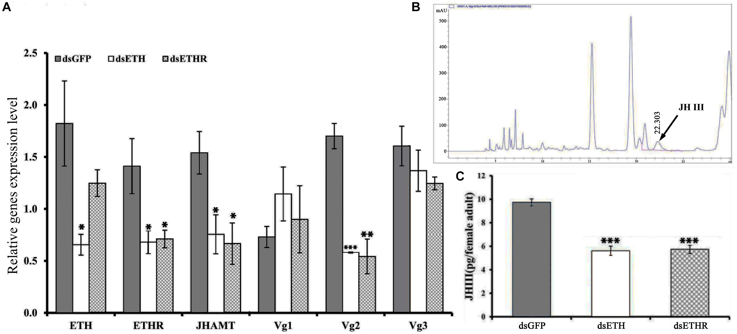 Figure 4. Silencing efficiency of genes of the ETH signaling (BdETH/BdETHR) in the female adult. (A) BdETH, BdETHR, BdJHAMT, BdVg1, BdVg2, and BdVg3 transcript levels after silencing with RNAi compared with control. (B) HPLC spectrum of crude extract and JH III peak is detected in 22.303 min. (C) The column chart represents the JH III titer per female adult. Data are means ± SD. Asterisks indicate significant differences with relative expression (∗P < 0.05; ∗∗P < 0.01, ∗∗∗P < 0.001).