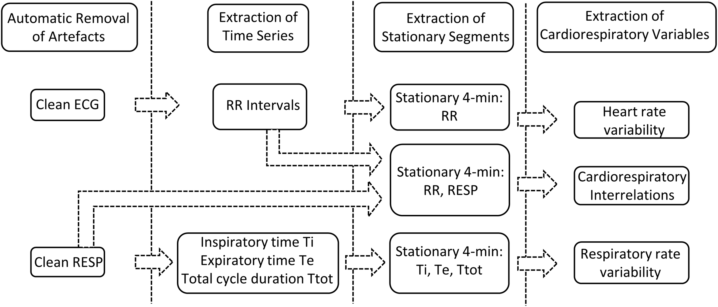 Our previously developed semi-automated processing approach was applied on ECG and RESP signals recorded from non-sedated animals. Each step of the developed approach, represented in Figure 2, has been detailed previously (Al-Omar et al., 2018) and is briefly presented hereafter.