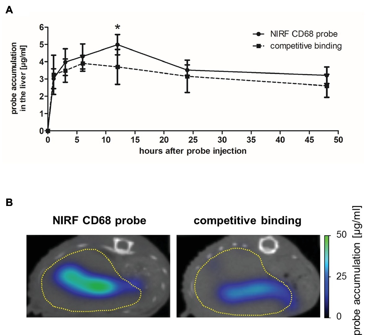 Figure 3. In vivo specificity of the NIRF CD68 probe. To analyze the in vivo specificity of the NIRF CD68 probe, a competitive binding experiment was performed in which a 5-fold excess of unlabeled CD68 antibody was injected 1 h prior to the injection of the NIRF CD68 probe (competitive binding group). Probe accumulation in the liver was compared to the concentration measured after injection of the NIRF CD68 probe alone (control group). (A) Quantitative analysis of probe accumulation in the liver showed a significant difference in the mean concentration 12 h after injection (*p < 0.05; data are presented as mean values ± SD). (B) Transversal FMT-μCT fusion images of representative mice 12 h after injection show a high fluorescent signal in the liver of the control mouse and a strongly reduced signal in the liver as a result of competitive binding (dashed yellow line indicates the liver).