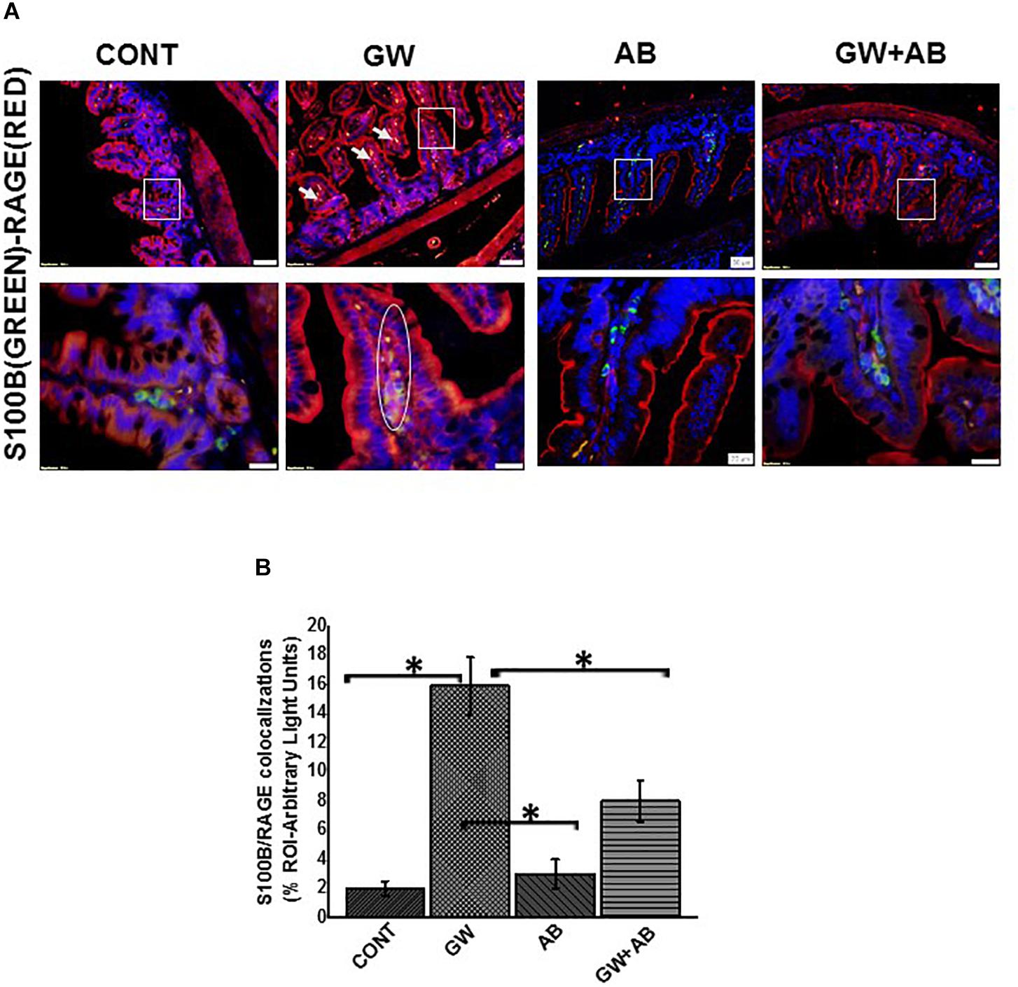 Figure 5. Formation of S100B/RAGE complex in small intestine. (A) S100B(Green)/RAGE(Red) complex formation expression in EGC in small intestine tissues. Protein expression levels were assessed by immunofluorescence microscopy of tissues at (top panel magnification 200X; scale 50 μm and bottom panel magnification 600X; scale 20 μm). Images show immunoreactivity the distal part of the small intestine for gulf war chemical treated mice (GW, n = 9), vehicle control (CONT, n = 9), mice treated with antibiotics only (n = 4) and mice co-exposed GW chemicals and antibiotics (GW + AB, n = 9). (B) Quantitative morphometric analysis of immunoreactivity for S100B/RAGE is represented as colocalization events per field for randomly chosen fields (% ROI) (∗P < 0.05).