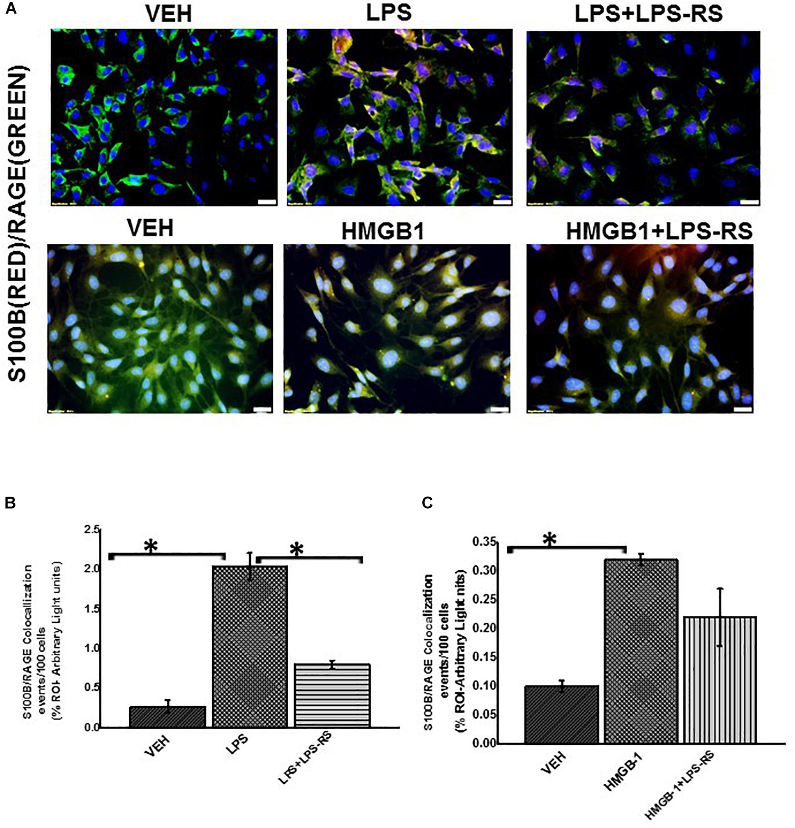 Figure 8. EGC exposed to LPS or HMGB-1 change to a reactive phenotype. (A) S100B/RAGE complex formation in rat Enteric Glial Cells (EGC) (n = 6). Colocalization of S100β and RAGE in EGC treated with either vehicle control (VEH) or LPS, LPS + LPS-RS, HMGB1 or HMGB-1 + HMGB-1 + LPS-RS was determined by immunofluorescence microscopy at (total magnification 400X and scale 20 μm). (B,C) Quantitative morphometric analysis of S100B/RAGE complex formation. Colocalizations between red and green immunoreactivity were determined for every 100 cells per field for randomly chosen fields and represented as immunoreactivity in the region of interest (% ROI) (∗P < 0.05).