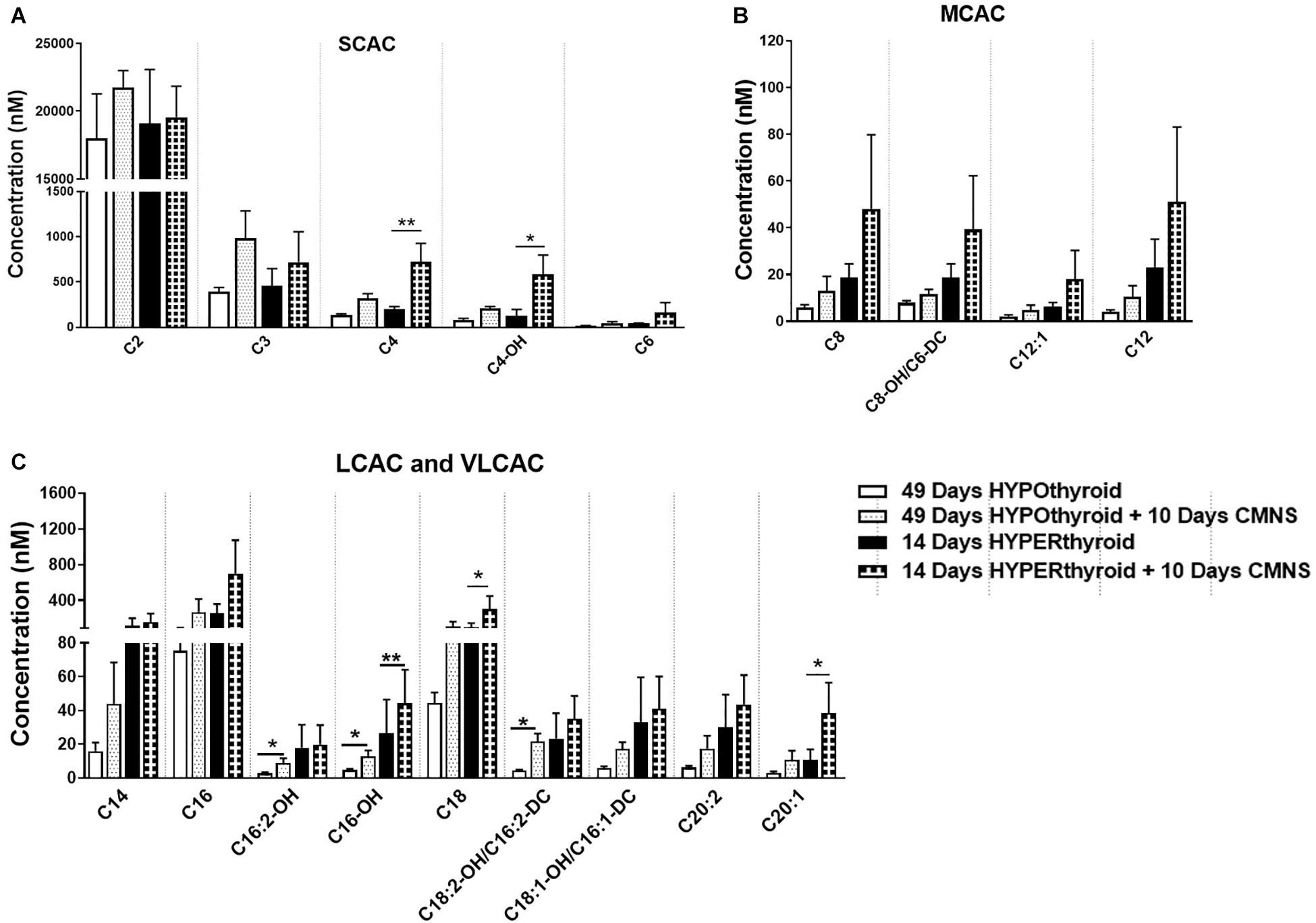 Figure 7. The levels of acylcarnitines in the EDL muscle with or without CMNS from hypothyroid (n = 5) and hyperthyroid (n = 3) rabbits. (A) Short chain acylcarnitines (SCAC). (B) Medium chain acylcarnitines (MCAC). (C) Long chain (LCAC) and very long chain acylcarnitines (VLCAC). Data were analyzed by two way repeated measures ANOVA followed by Fisher’s least significant difference multiple comparisons test. Data are shown as mean ± SEM, ∗P < 0.05, ∗∗P < 0.01.