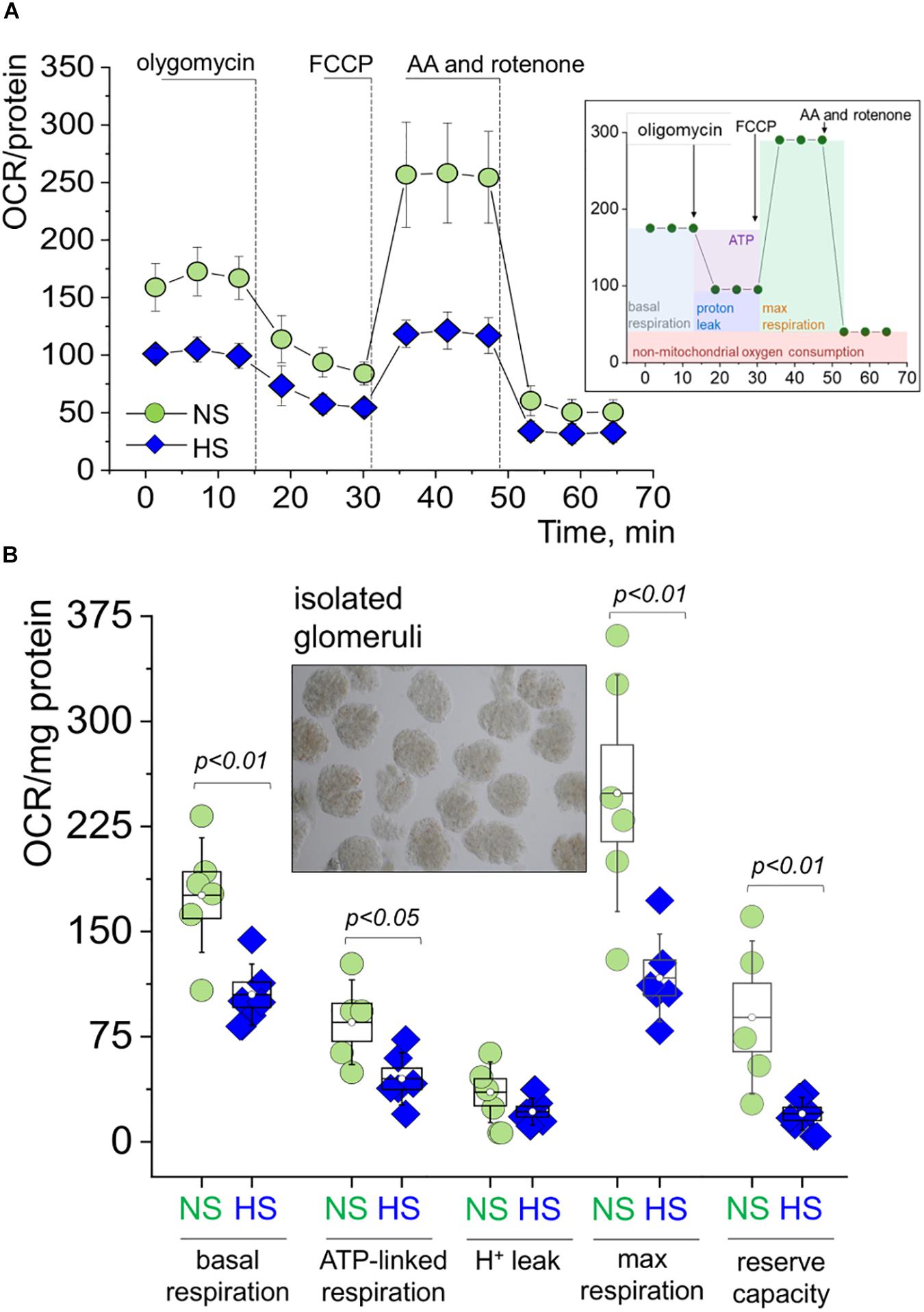 Figure 4. Mitochondrial respiration in the freshly isolated glomeruli during SS hypertension. (A) Oxygen consumption rate (OCR, pmol/min/mg protein) values obtained in a Seahorse experiment from glomeruli freshly isolated from the renal cortex of rats fed a high salt (HS) or normal salt (NS) diet. Shown are curves summarized from at least five rats per group, three to five replicates per rat; error bars are SEM. Right inset panel illustrates the experimental design. (B) Summary for basal respiration, ATP production, proton leak, maximal respiration, and reserve respiratory capacity as measured in the seahorse experiment shown in Graph. OCR is expressed in pmol/min/mg protein (A). Each data point is an average of at least three replicates per individual rat. An inset shows a typical preparation of isolated glomeruli. All data were compared using a one-way ANOVA with Holm–Sidak post hoc test. NS, normal salt; HS, high salt.