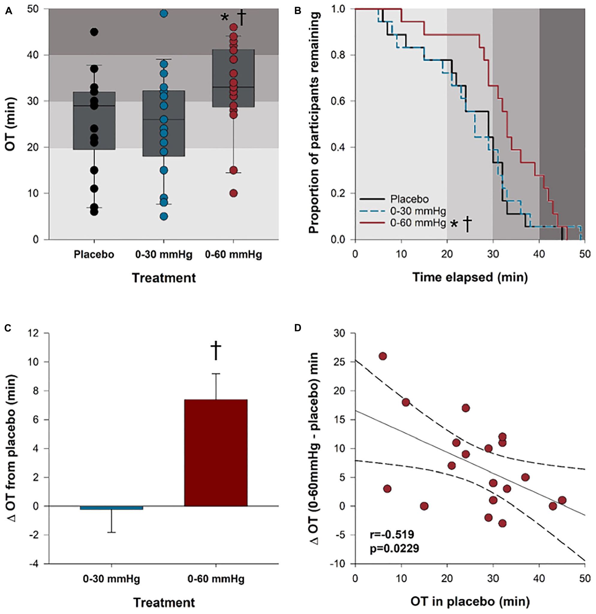 Figure 3. Orthostatic tolerance. (A) Orthostatic tolerance, rounded to the nearest minute, is shown for all three tilt conditions. (B) Kaplan–Meier plot depicting the proportion of participants remaining (who have not reached presyncope) in each condition at any given tilt time. (C) Bar plots showing the mean improvement in orthostatic tolerance for each compression condition relative to the placebo. (D) The mean improvement in orthostatic tolerance with 0–60 mmHg compression compared to placebo was dependent on baseline orthostatic tolerance (placebo). ∗Significantly different from placebo (p < 0.05); †significantly different from 0 to 30 mmHg compression (p < 0.05). Shaded gray boxes of increasing intensity represent stages of the tilt test and increasing orthostatic stress. OT, orthostatic tolerance.