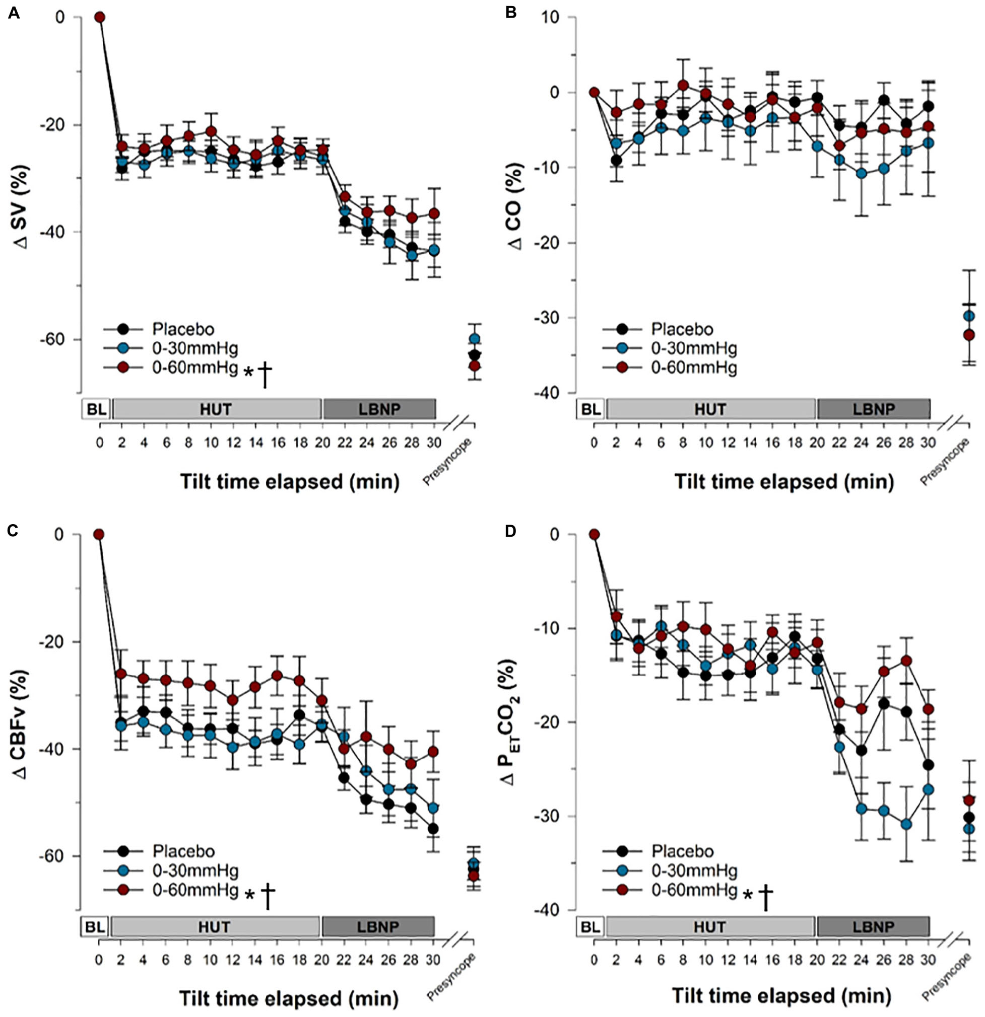 Figure 6. Stroke volume, cardiac output, cerebral blood flow velocity and end-tidal CO2 responses during tilt testing. The time course of stroke volume (A), cardiac output (B), cerebral blood flow velocity (C) and end-tidal carbon dioxide (D) during tilt are shown. Symbols (mean ± SEM) reflect averaged data, over the last 30 s of every 2 min interval and are reported as a percentage change from supine values. Main effects of condition throughout tilt are shown. ∗Significantly different from placebo (p < 0.001); †significantly different from 0 to 30 mmHg compression. SV, stroke volume; CO, cardiac output; CBFv, cerebral blood flow velocity; PETCO2, end tidal partial pressure of carbon dioxide; BL, baseline; HUT, head-upright tilt; LBNP, lower body negative pressure.