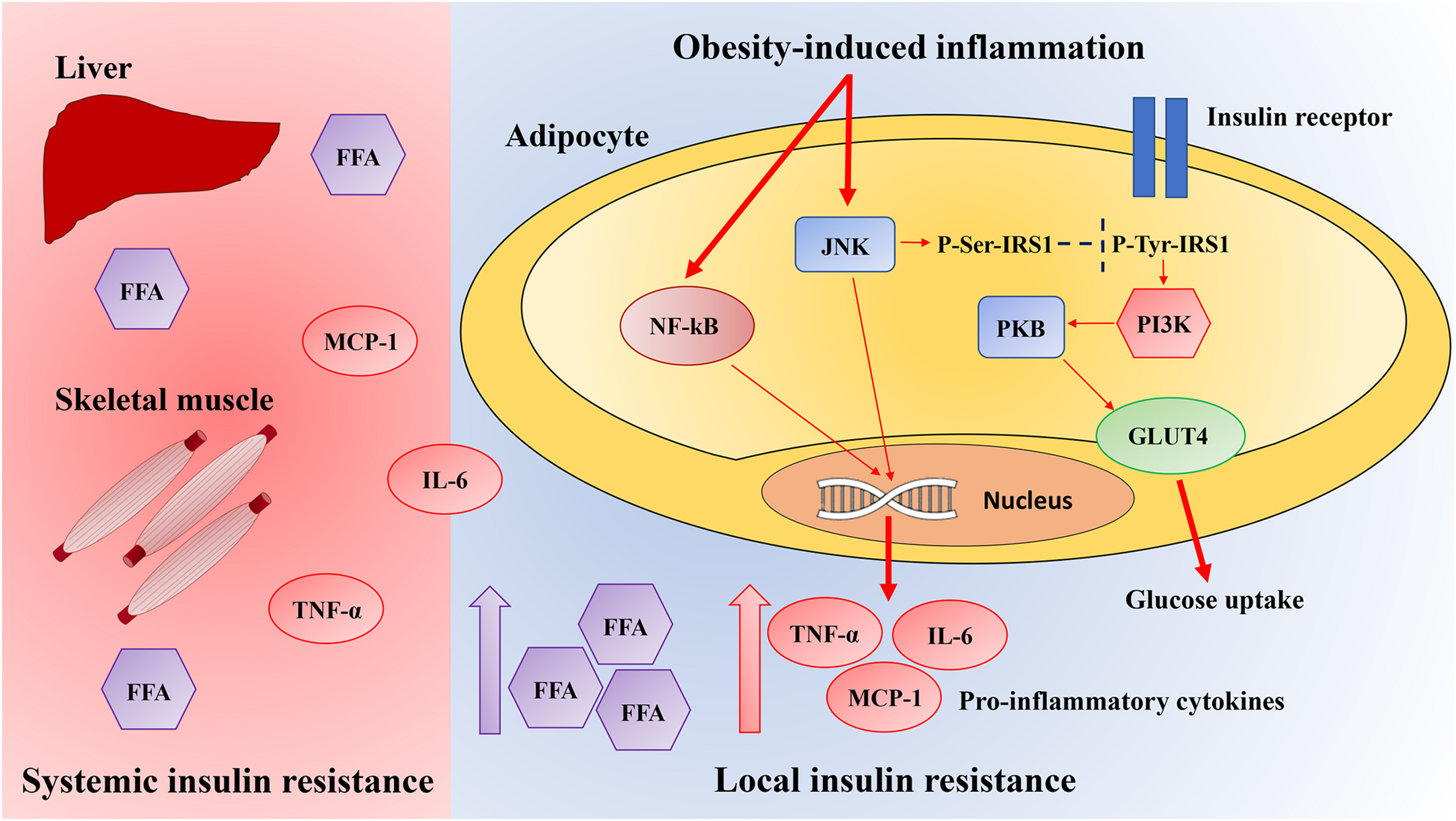 Pathways linking local obesity-induced inflammation to systemic insulin resistance. Obesity results in the activation of the inflammatory signaling pathways mediated by JNK and nuclear factor-kappa B (NF-κB). Once activated, these pathways induce the production of several pro-inflammatory cytokines in adipocytes, which contribute to insulin resistance and pro-inflammatory macrophages infiltration. Activation of the JNK signaling pathway starts the transcription of pro-inflammatory genes and inhibits the insulin signaling pathway through the insulin receptor substrate-1 (IRS-1) inhibitory serine phosphorylation, which reduces the phosphatidylinositol 3-kinase (PI3K)/protein kinase B (PKB) signaling pathway. Instead, NF-κB signaling pathway activation culminates in the increased expression of several NF-κB target genes such as tumor necrosis factor-α (TNF-α), interleukin-6 (IL-6), and monocyte chemotactic protein-1 (MCP-1), which leads to serine phosphorylation of IRS-1, therefore preventing insulin signaling. The inflammatory mediators including free fatty acids (FFA), IL-6, TNF-α, and MCP-1 also spread through systemic circulation and activate JNK and NF-κB signaling pathways in the liver and skeletal muscle, inhibiting systemic insulin signaling. GLUT4, glucose transporter type 4.