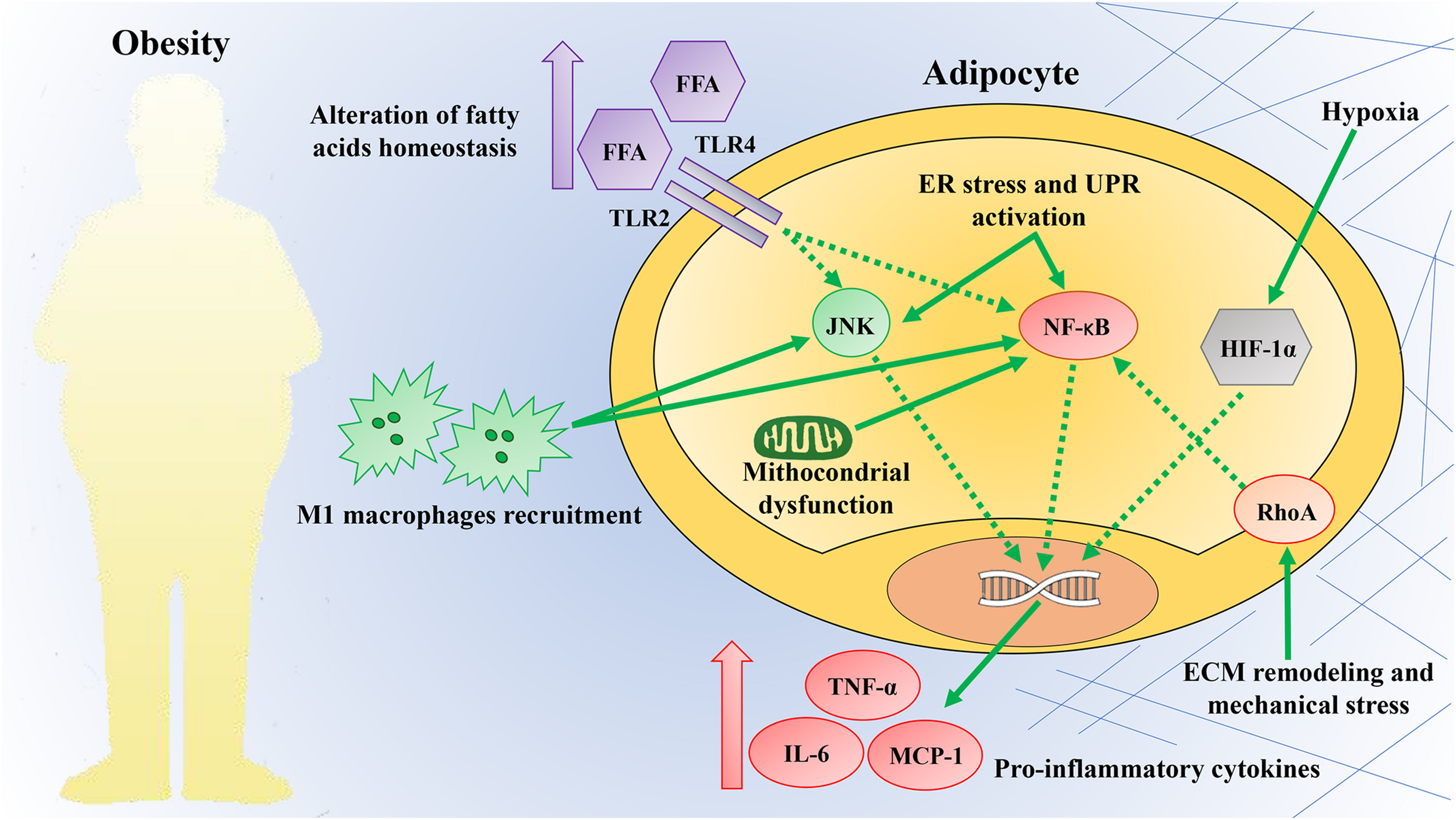 Obesity triggers inflammation. Obesity provides a plethora of intrinsic and extrinsic signals capable of triggering an inflammatory response in AT. These mechanisms are commonly considered the link between chronic caloric excess and adipose tissue inflammation. Some of these mechanisms include dysregulation of fatty acid homeostasis, increased adipose cell size and death, local hypoxia, mitochondrial dysfunction, endoplasmic reticulum (ER), and mechanical stress. These triggers converge on the activation of the c-Jun N-terminal kinase (JNK) and nuclear factor-kappa B (NF-κB) pathways, commonly considered signaling hubs. The activation of these pathways increases the production of pro-inflammatory cytokines and promotes the infiltration of pro-inflammatory M1 macrophages. TLR2, Toll like receptor 2; TLR4, Toll like receptor 4; FFA, free fatty acids; UPR, unfolded protein response; HIF-1α, hypoxia-inducible factor-1α; RhoA, ras homolog gene family, member A; TNF-α, tumor necrosis factor-α; IL-6, interleukin-6; MCP-1, monocyte chemotactic protein-1; ECM, extracellular matrix.