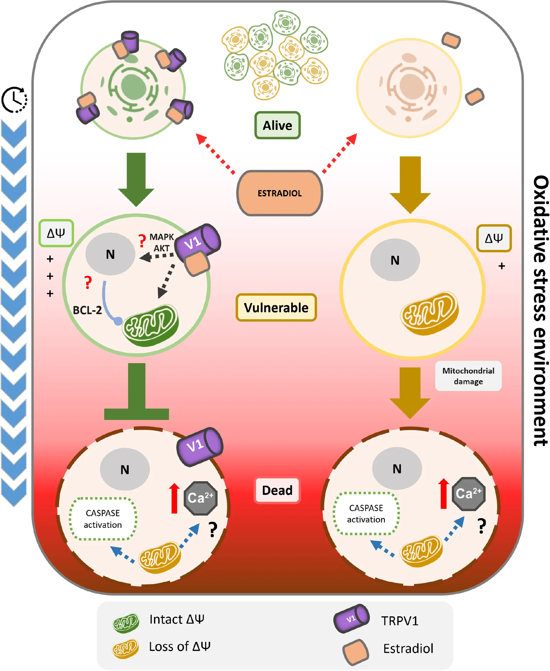 Evidence that an initial pulse of 17β-estradiol is sufficient for cell protection is noteworthy. It is likely that H2O2 induces cell vulnerability through early mitochondrial failure, determining progression to cell death. Here, TRPV1 mediated 17β-estradiol ability to inhibit mitochondria depolarization thus preserving its function, diminishing the size of vulnerable population and decreasing cell death.