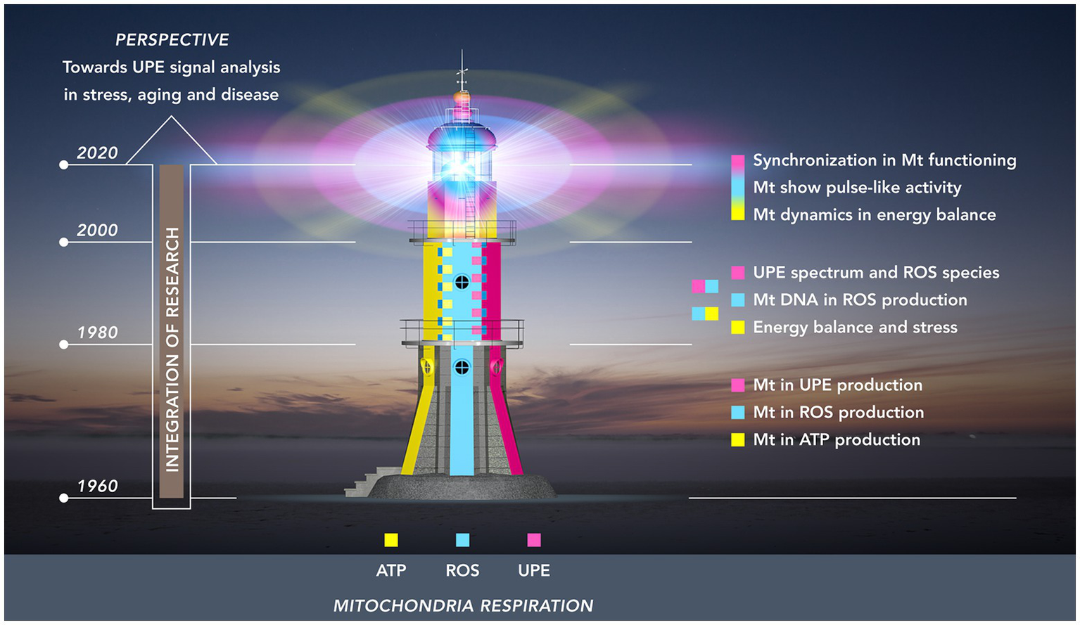 Figure 1. Research towards the mitochondrial functioning as a “(ultra-weak) light house” organelle. The light house from base till top represents three periods of 20 years: 1960–1980 (lowest floor); 1980–2000 (mid-floor); 2000–2020 (top-floor). The colors illustrate three developing fields of research related to mitochondria: energy (ATP) production (yellow); ROS production (cyan blue); UPE production (magenta red). These research fields originally developed independently in the first period. In the second period, two integrations took place: (a) energy balance and ROS production and (b) ROS production and UPE. The third period (top floor) shows the intertwining of colors representing the dynamic pulsation kinetics in energy and ROS production and the development of procedures to detect analogous pulsation in UPE signals of living tissue.