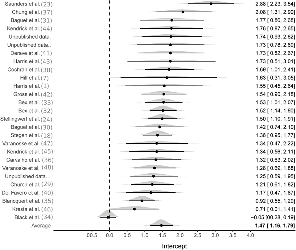 Aggregate analyses were based on effect sizes calculated from all available studies using the SMD pre to post change in MCarn levels. One hundred and eight effect sizes were available from BA groups only, six of which were removed as they were outliers (ES > 5). The multilevel meta-analysis with no study covariates estimated a large pooled effect size of 1.5 [95%CrI 1.2–1.8], with substantial between (τ∧20.5 = 0.6) and within (ϵ∧20.5 = 0.7) study variance (Figure 2). The same model applied to effect sizes calculated with supplementation and control group data (22 studies and 56 effect sizes) also produced a large pooled effect size of 1.7 [95%CrI: 1.3–2.1], with substantial between (τ∧20.5 = 0.8) and within (ϵ∧20.5 = 0.5) study variance (Figure 3). Using a simple linear model, the effects of cumulative BA dose was assessed by centering on the mean value (208 g). Results demonstrated a large effect at the mean cumulative dose (1.5 [95%CrI: 1.2–1.8]) and an estimated 0.23 [95%CrI: 0.06–0.49] increase in effect size per additional 100 g. Similar results were obtained for effect sizes calculated with supplementation and control group data (effect at mean: 1.7 [95%CrI: 1.3–2.1]; effect per additional 100 g: 0.16 [95%CrI: 0.01–0.31]). Insufficient data were available to ascertain if age altered the effects of BA supplementation, but subset analyses were conducted to investigate the impact of sex and the method used to measure MCarn, using effect sizes generated from supplementation groups only. Sixteen studies were selected that used the most common dosing protocol (cumulative dose between 130 and 180 g) comprising a total of 56 effect sizes. For the sex comparison there were eight effect sizes from a female only group, 38 effect sizes from a male only group and 10 effect sizes from a mixed group. No substantive evidence of an effect of sex was obtained (male vs. female: −0.32 [95%CrI: −1.1–0.43]; male vs. mixed: −0.00 [95%CrI: −0.95–0.88]). Across the 16 studies, 40 effect sizes were obtained from MCarn values measured with non-invasive scanning devices (i.e., HR-MRS) and 16 effect sizes obtained with muscle biopsy based analyses (mainly assessed by HPLC, with one study using UPLC and one using mass spectrometry), with some evidence of increased effects with HPLC (0.16 [95%CrI: 0.01–0.43]).