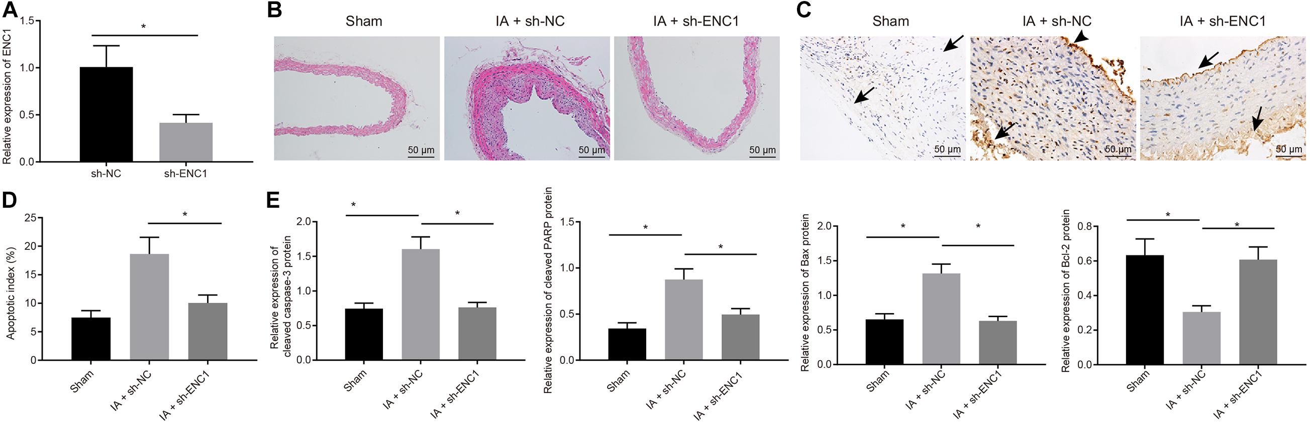Figure 6. Silencing ENC1 reduces endothelial cell apoptosis in vivo to protect rats from IA. Rats were induced with IA model and treated with sh-ENC1 or sh-NC, with the sham-operated rats as control. (A) The expression of ENC1 in rats determined by RT-qPCR. (B) HE staining (×200) for the ACA/OA branch sections of rats. (C) The representative images of TUNEL staining (×200) for apoptosis of rats (arrows indicate the arterial wall). (D) Quantitative analysis of cell apoptosis in rats evaluated by TUNEL staining. (E) The expression of apoptosis-related factors (cleaved Caspase-3, cleaved PARP1, Bax, and Bcl-2) as determined by Western blot analysis and quantified by Image J software. *p < 0.05. The measurement data were expressed as mean ± standard derivation. Comparisons between two groups were analyzed by unpaired t test, and comparisons among multiple groups were analyzed by one-way ANOVA and followed by Tukey’s post hoc test. The cell experiment was conducted three times independently. The sham group: n = 12, the IA + sh-NC group: n = 12, and the IA + sh-ENC1 group: n = 6.