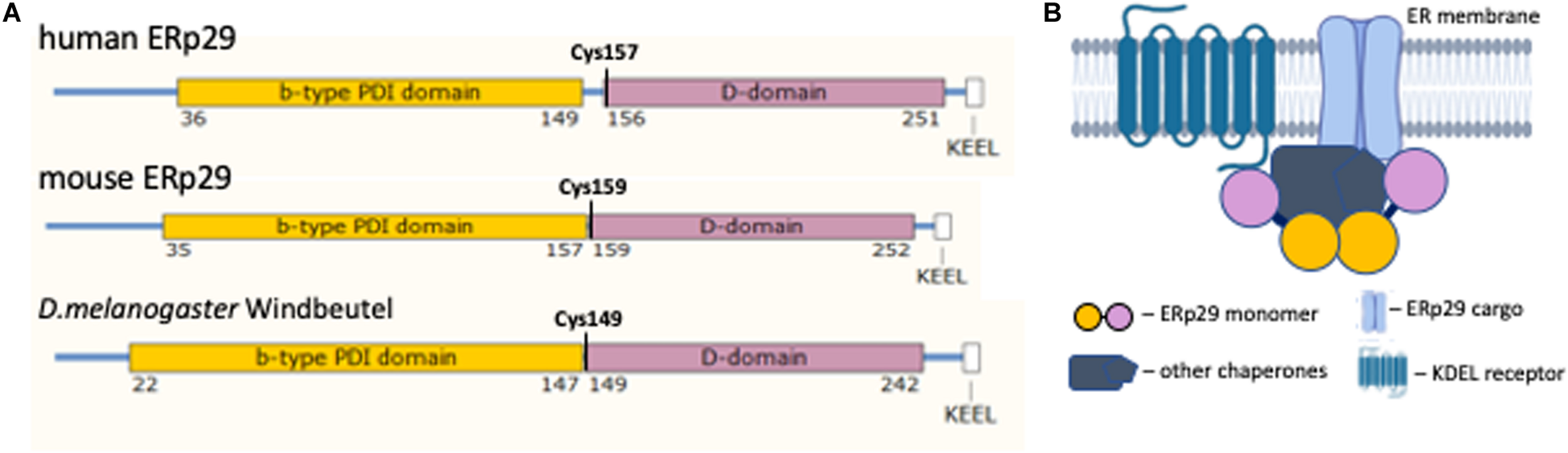 Insight into the structural and functional domains of human ERp29 can be inferred from studies of homologs and paralogs from other species, including rat and mouse ERp29, and Drosophila melanogaster Windbeutel (Wind). Wind expression in Drosophila is essential for the transport of Pipe, a glycosaminoglycan-modifying enzyme with homology to heparan sulfate 2-O-sulfotransferase in mammals (Sergeev et al., 2001), to the Golgi where it regulates dorsal-ventral embryogenesis of D. melanogaster embryos via an extracellular serine protease cascade (Sen et al., 2000). When Pipe is expressed in tissues without Wind, Pipe remains in the ER and embryo dorsal-ventral patterning does not occur; this results in embryonic death (Sen et al., 2000). Unlike mammalian ERp29, the D. melanogaster Wind protein has a conserved (C-X-X-C) PDI domain (Ma et al., 2003). The important structural and functional homology of the C-terminal D-domain between Wind and human ERp29 (Ma et al., 2003), allowed for better characterization of ERp29 function in earlier studies.