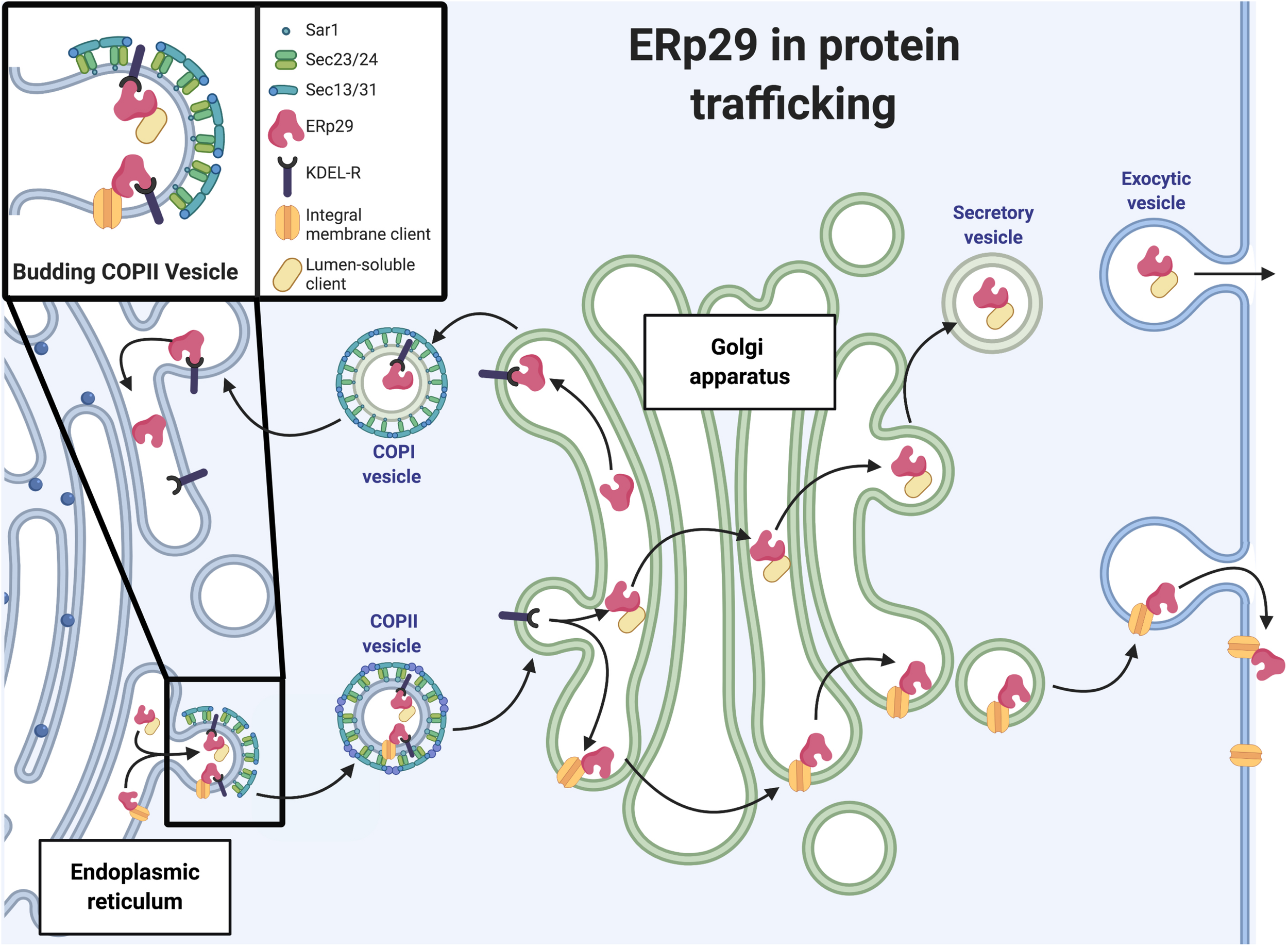 ERp29 in protein trafficking. Schematic representation of ERp29 role in ER to Golgi secretory pathway (image created with BioRender.com).