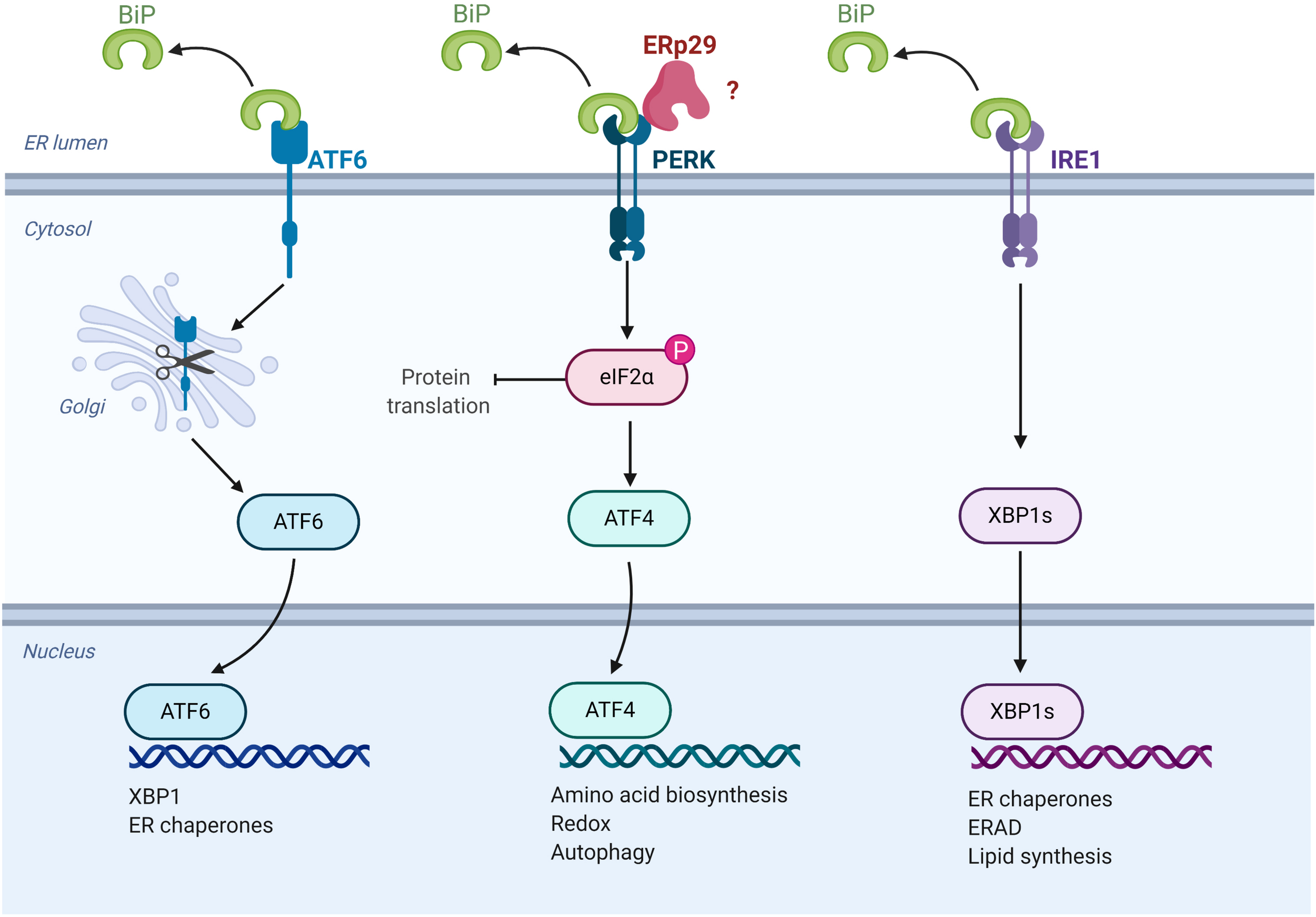 ERp29 role in the unfolded protein response (UPR). Schematic representation of UPR pathways, highlighting the potential site of ERp29 action (image created with BioRender.com).