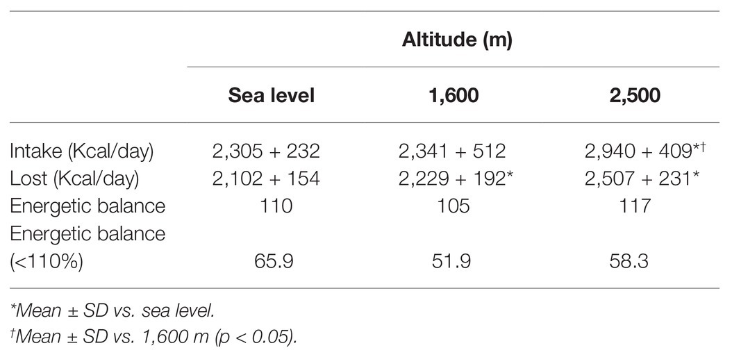 In our study, we used FAO/WHO/UNU equations (2001) to estimate the basal metabolic rest (BMR). We calculated total energetic expenditure (EET) using the following equation; EET = BMR × physical activity index. We defined a physical activity index using three levels according to lifestyle type which had persisted longer than their job occupation: sedentary (mean 1.55), moderate (mean 1.76), and active (mean 2.1; FAO/WHO/UNU, 2004; Westerterp, 2017). Physical activity in the workplace at sea level, 1,600, and 2,500 m was evaluated indirectly by using a IPAQs survey (International Physical Activity Questionnaire short; Ainsworth et al., 2000) in the morning of the 4th day, previous to the maximal aerobic capacity test.