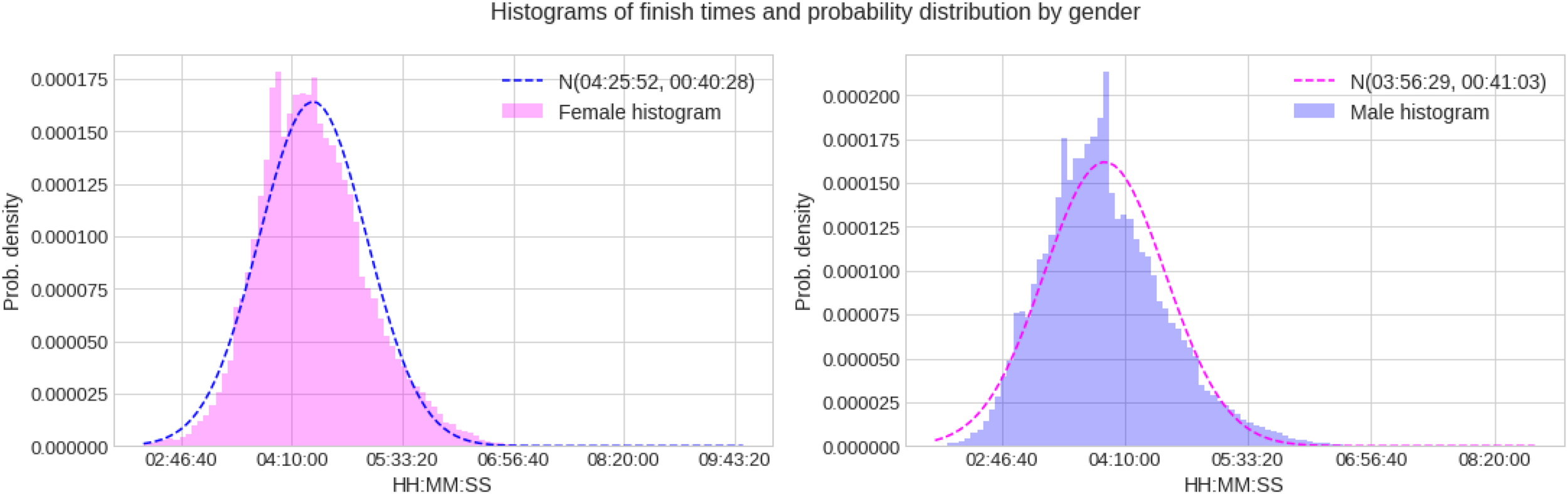 Marathon race times histograms and probability distributions for women and men.
