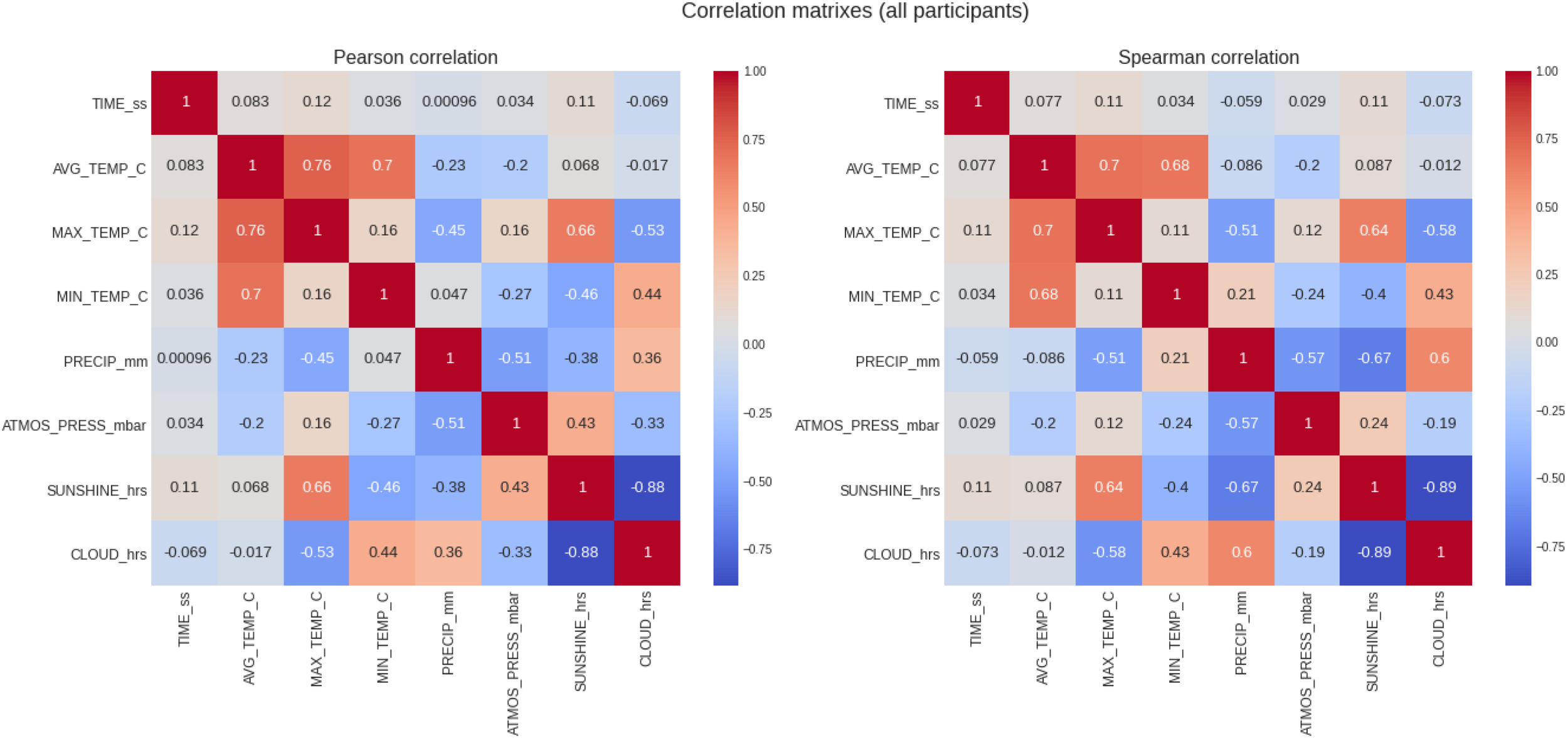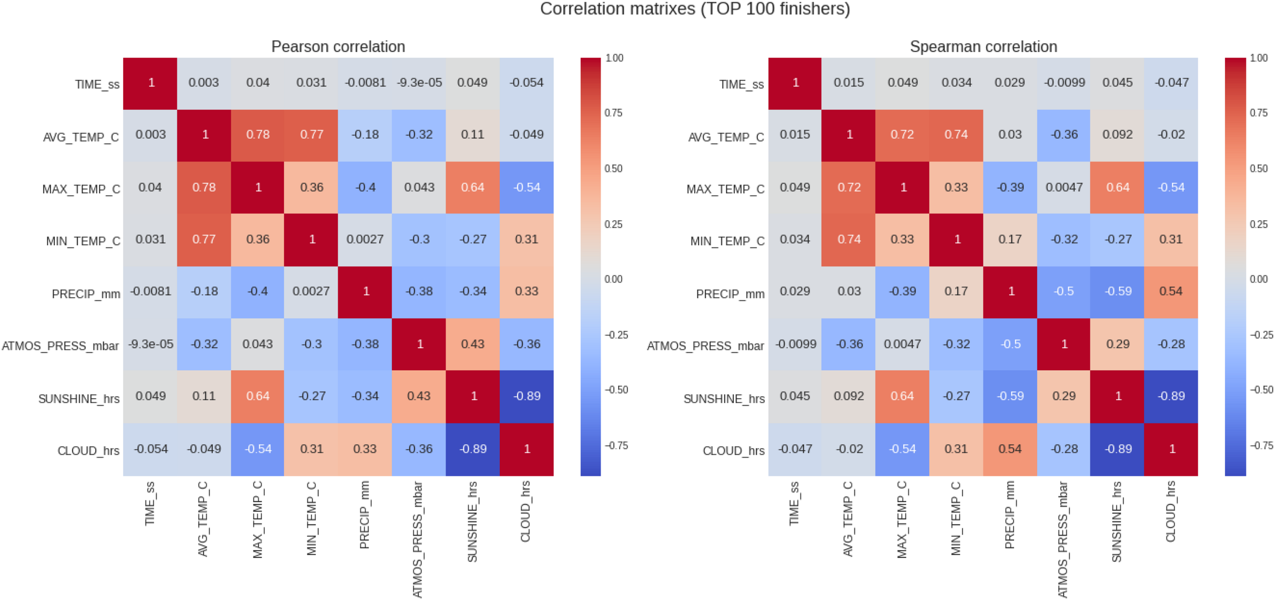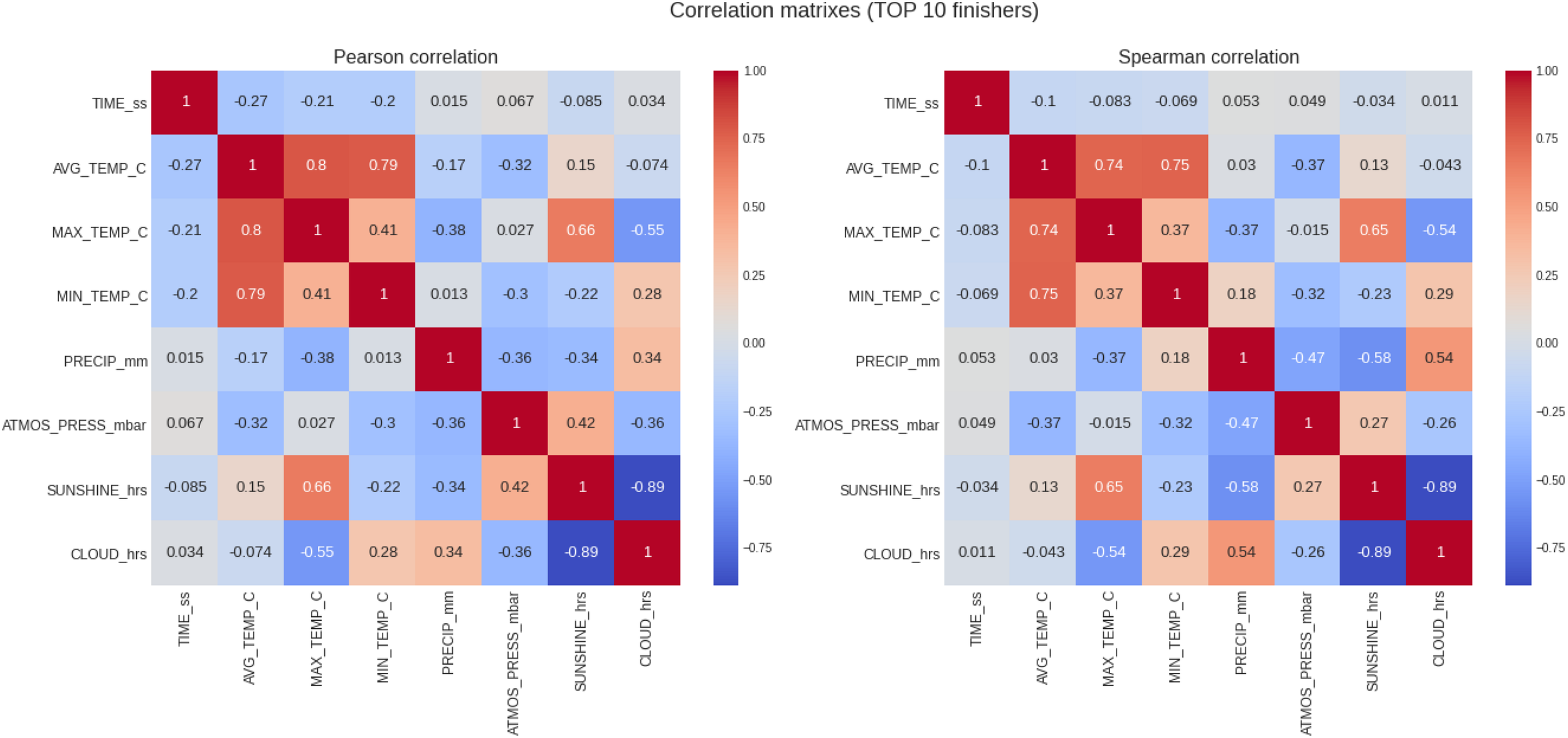 Analysis of the correlation of the target variable (marathon race time) and the descriptive variables (weather conditions) for all runners. PRECIP, precipitation in mm, SUNSHINE duration in hours, CLOUD cover in hours; ATMOS_PRESS, atmospheric pressure in mbar; AVG_TEMP, average temperature in degrees Celsius; MAX_TEMP, maximum temperature in degrees Celsius; MN_TEMP, minimum temperature in degrees Celsius.
