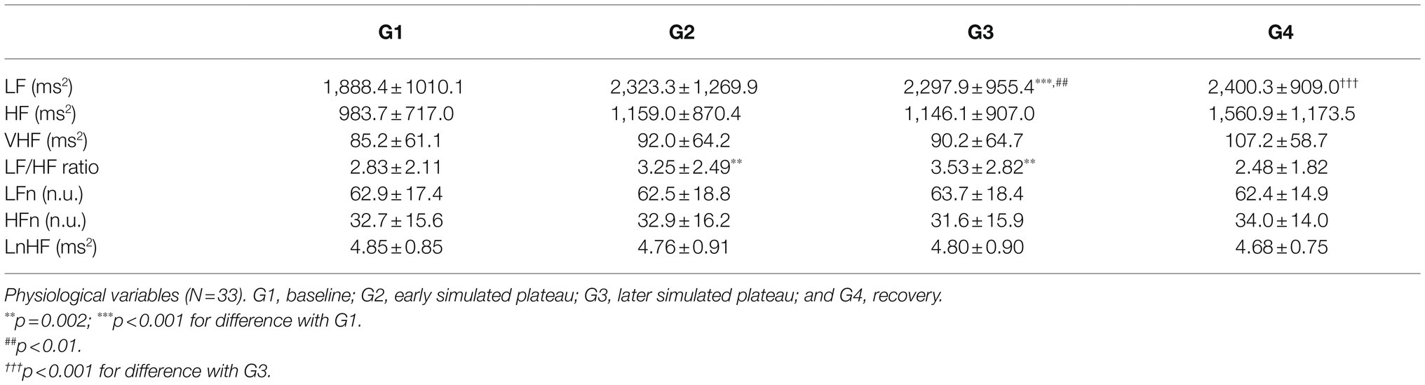 It is now generally accepted that the HF component of HRV mainly reflects the level of parasympathetic activity. In contrast, the LF component primarily reflects the joint sympathetic and parasympathetic activity levels. LF/HF ratio is used to measure the balance between sympathetic and parasympathetic nerves (Boardman et al., 2002; Bachler, 2017). The frequency-domain characteristics of HRV are shown in Table 4 and Figures 3A–D. LF metrics increased significantly from baseline levels longitudinally over time, and the LF/HF ratio within the simulated plateau experiment also changed significantly compared to baseline. Still, equilibrium was restored more quickly after the investigation. Also, the standardized LF and HF indicators reflecting sympathetic and parasympathetic regulation changes did not differ (p = 0.784, p = 0.636, for LFn and HFn, respectively). The box plot in Figure 2B shows that the LF/HF ratio in the G4 phase, which indicates the recovery state after the simulated plateau experiment, was more concentrated relative to the distribution in the investigation.