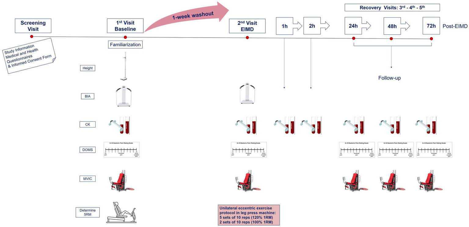 Schematic of experimental procedures. BIA, body impedance analysis; CK, creatine kinase; MVIC, maximal voluntary isometric contraction for peak force; DOMS, delayed onset muscle soreness via visual analogue scale; RM, repetition maximum; and EIMD, exercise-induced muscle damage. Second visit combines both pre- and post-measurements, immediately prior and following EIMD stimulus, respectively.