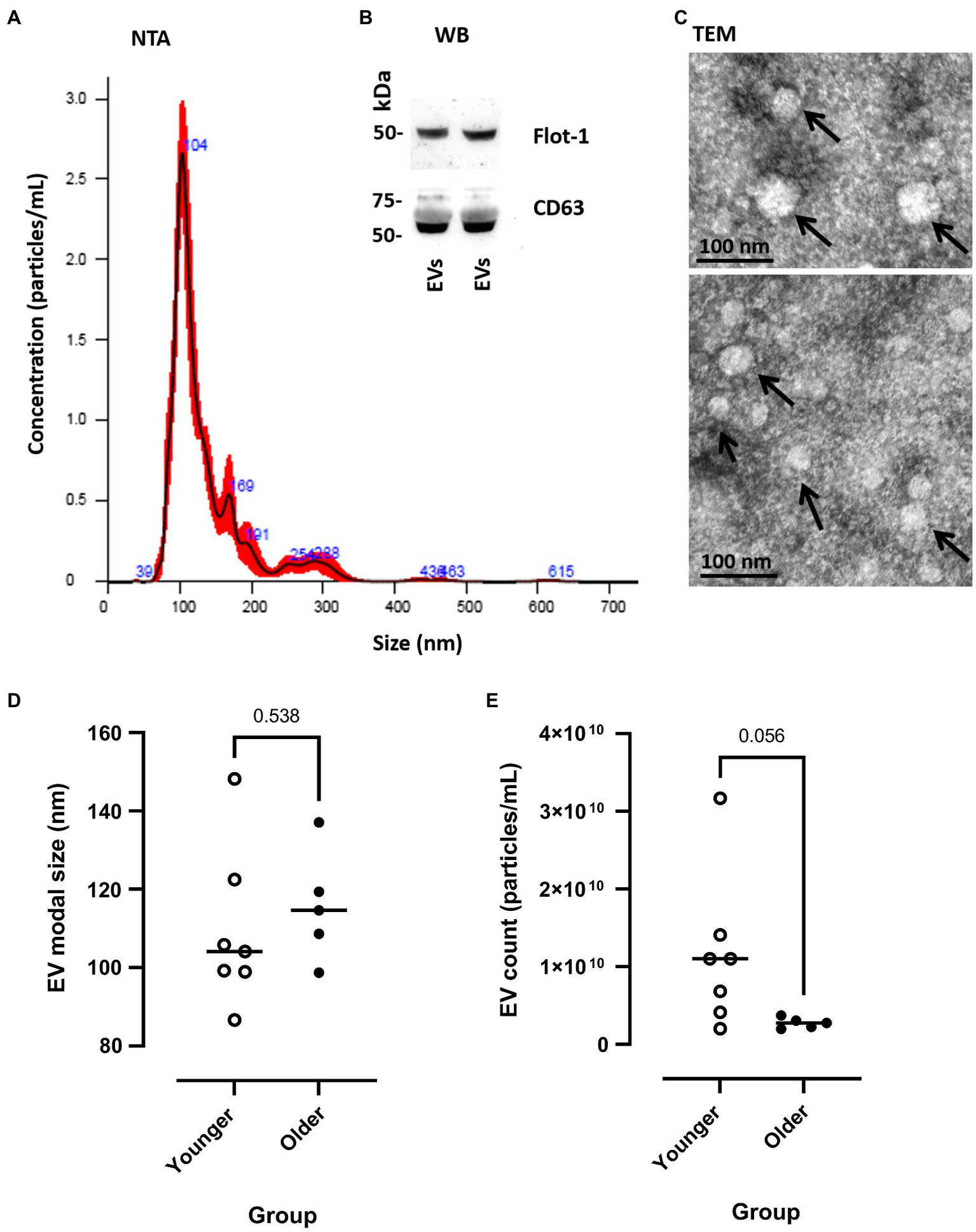 Measurement of EV modal size and count in younger and older participants. (A) Representative example of nanoparticle tracking analysis (NTA), SEM shown in red and mean in black line. (B) Western blotting of human plasma extracellular vesicles (EVs) showing positive for Flot-1 and CD63. (C) Transmission electron microscopy (TEM) images of human plasma-EVs, showing EV morphology; scale bar indicates 100nm. (D) EV modal size (nm) and (E) EV count (particles/ml) at pre-EIMD in younger (open circles) and older (closed circles) participants. Horizontal line indicates group means.