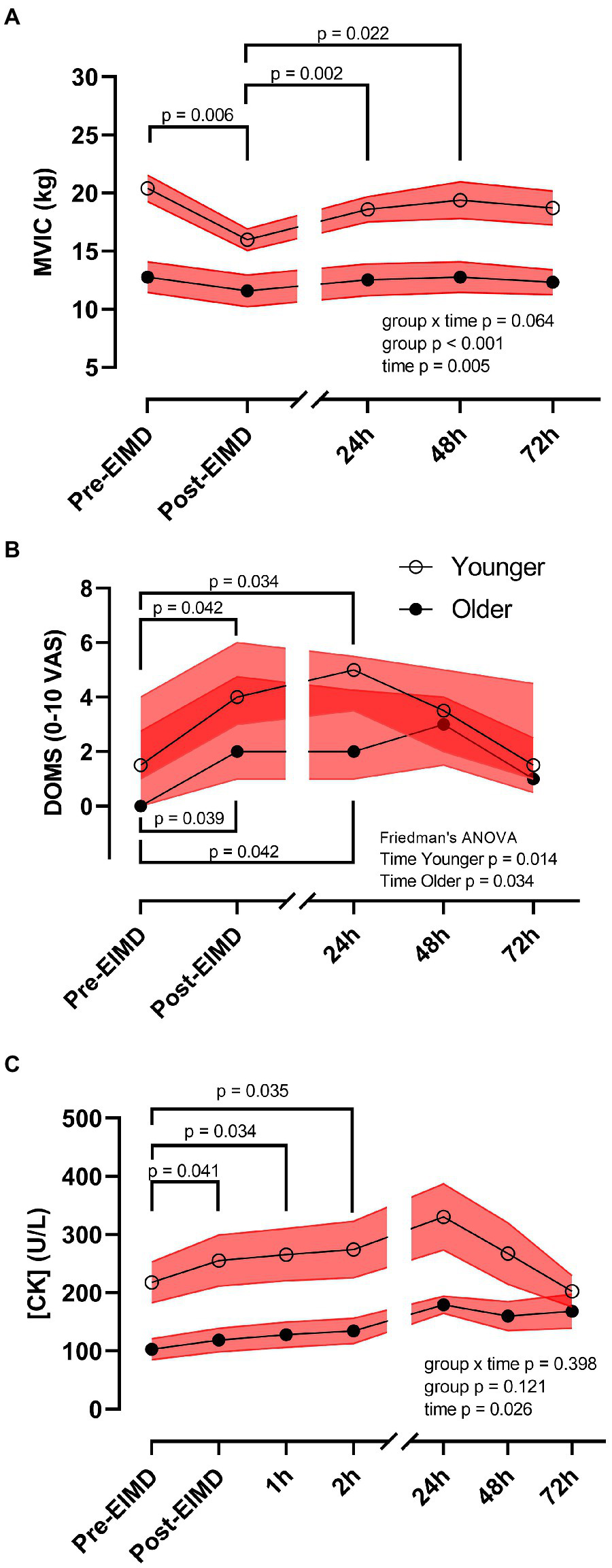 Exercise-induced muscle damage reduces muscle force and increases circulating creatine kinase (CK) concentrations independent of age. (A) MVIC (kg), (B) DOMS [0–10 visual analogue scale (VAS)], and (C) plasma CK (U/L) of younger (open circles) and older (closed circles) participants. Red shaded zones indicate SEM in (A,C), and interquartile range in (B), and black connected line indicates group means in (A,C), and medians in (B), values of p between timepoints as indicated. The scale brake indicates from hourly testing to 24-h intervals.