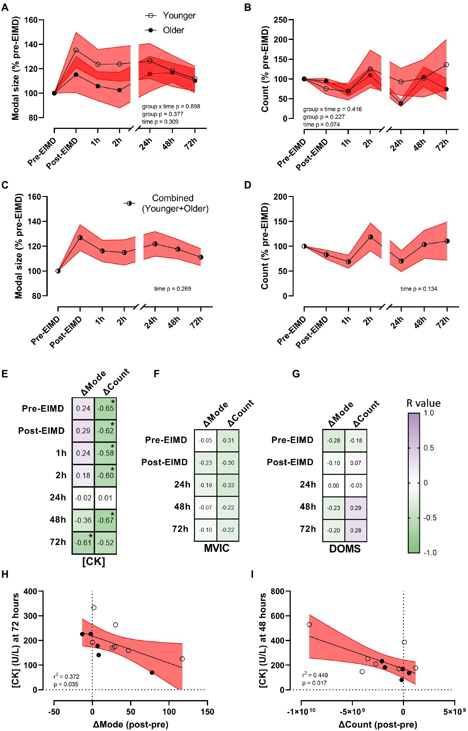 Alterations in EV modal size and count with exercise, and EV correlations with muscle damage markers. (A) EV modal size (% pre-EIMD) and (B) EV count (% pre-EIMD) as a function of timepoint between younger and older groups, (C) EV modal size (% pre-EIMD) and (D) EV count (% pre-EIMD) as a function of timepoint combined younger and older participants (n=12). Red shaded zones indicate SEM and black connected line indicates group means. The scale brake indicates from hourly testing to 24-h intervals. (E) Correlation matrix between change in EV modal size (ΔMode) or in EV count (ΔCount) as a function of CK (U/L), (F) as a function of MVIC (kg) and (G) as a function of DOMS (0–10 VAS) at each timepoint measured, with r values as shown. *Indicates significant association between variables (each p<0.05). Colour intensity for r values (purple indicates positive r value, green negative, white=0) as indicated. (H) CK (U/L) at 72h as a function of ΔMode (post-EIMD – pre-EIMD and I) CK (U/L) at 48h as a function of ΔCount (post-EIMD – pre-EIMD). Red shaded zone indicates 95% CIs. Open circles indicate younger, closed indicate older.