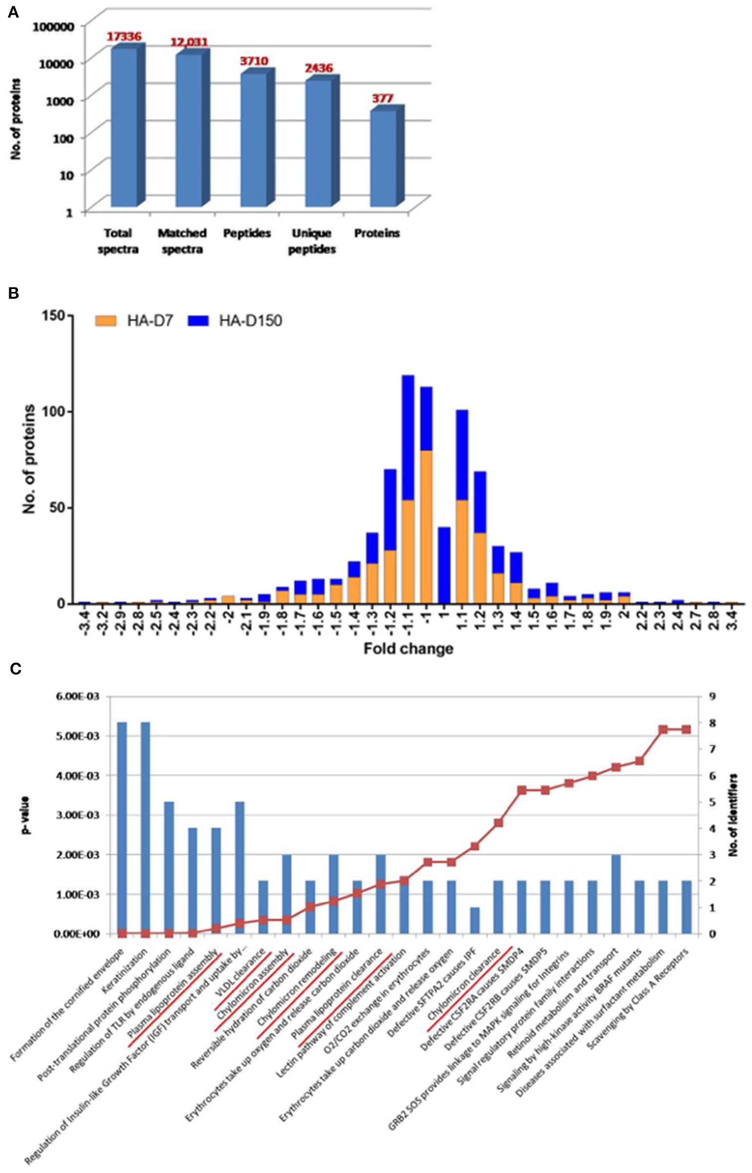 TMT based plasma proteomics analysis. (A) Bar graph representing spectra, peptides, and proteins identified from TMT-based LC-MS/MS. (B) The quantitative ratio histogram of quantitative proteins identified in the study groups (HA-D7 and HA-D150 with respect to sea level). (C) Top 25 significant pathways for the identified common upregulated proteins in HA-D7 and HA-D150 groups representing a number of identified proteins along with their p-value. Underlined signify identified pathways involved in lipoprotein metabolism.