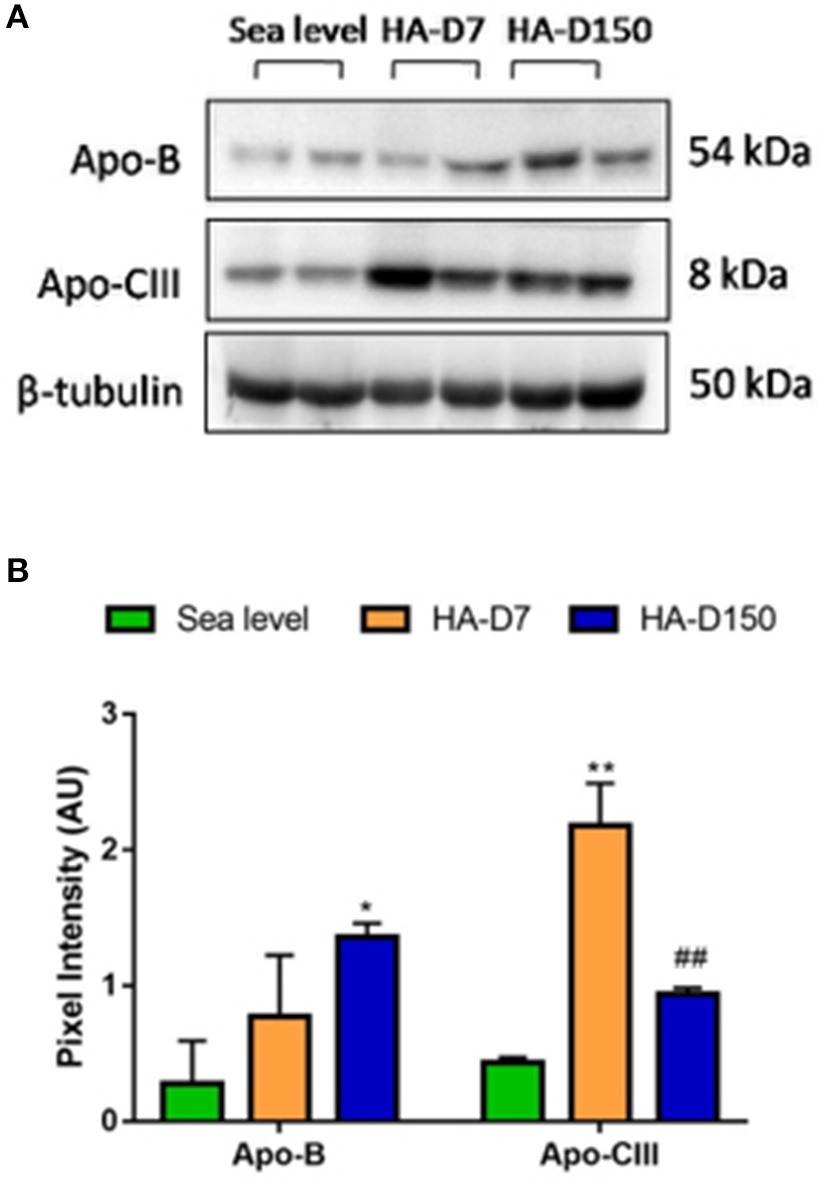Validation of plasma proteomics data (n = 6). (A) Western blot analysis of Apo-B and Apo-CIII along with tubulin as a loading control. (B) Densitometry analysis of Apo-B and Apo-CIII with respect to tubulin. *represents p < 0.05, **represents p < 0.01 with respect to sea level and ##represents p < 0.01 with respect to HA-D7.