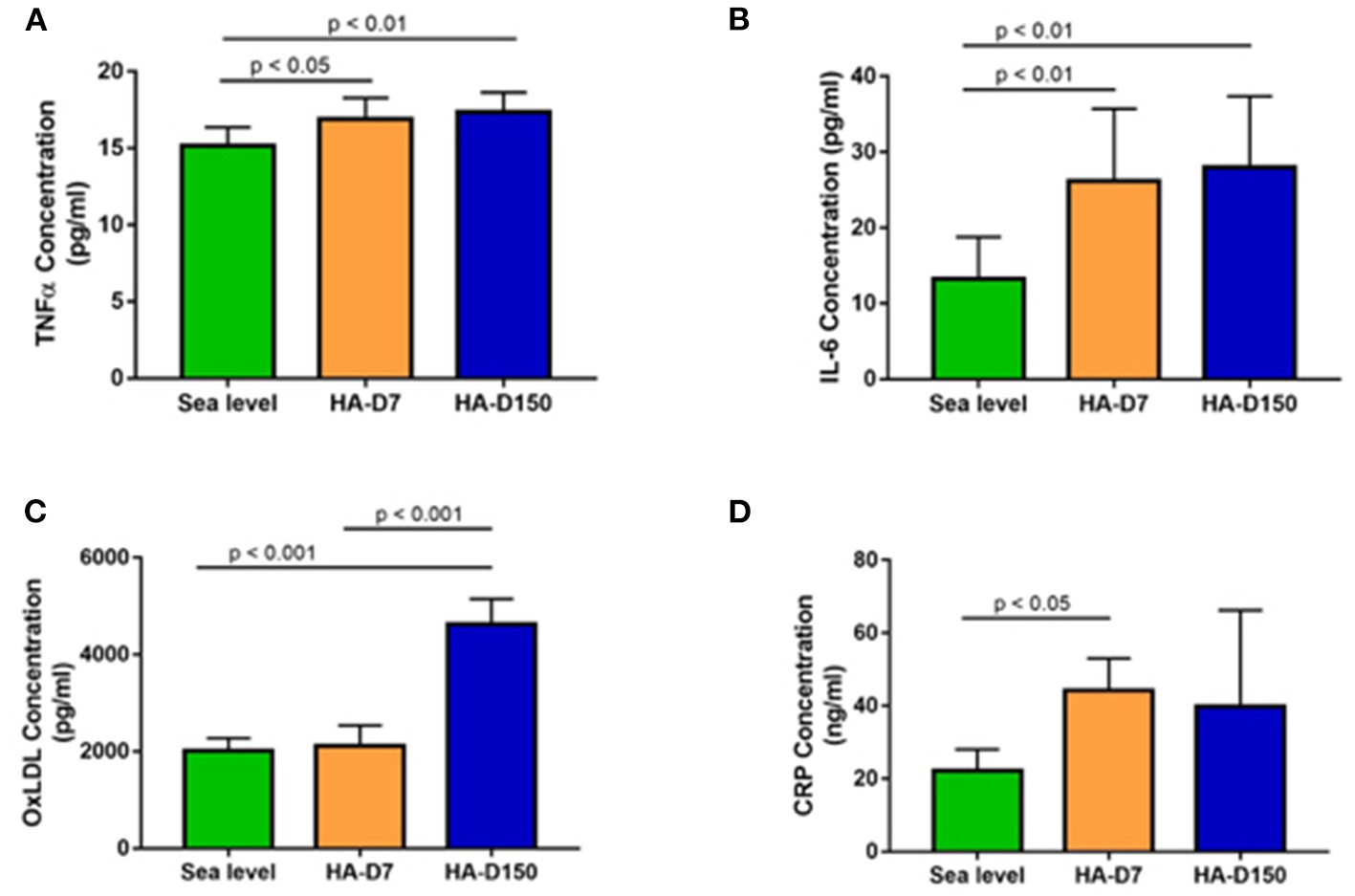 Assessment of inflammatory cytokines in the study groups (n = 8). ELISA-based estimation of (A) TNF-α, (B) IL-6, (C) ox-LDL, and (D) CRP for sea level, HA-D7, and HA-D150 groups.