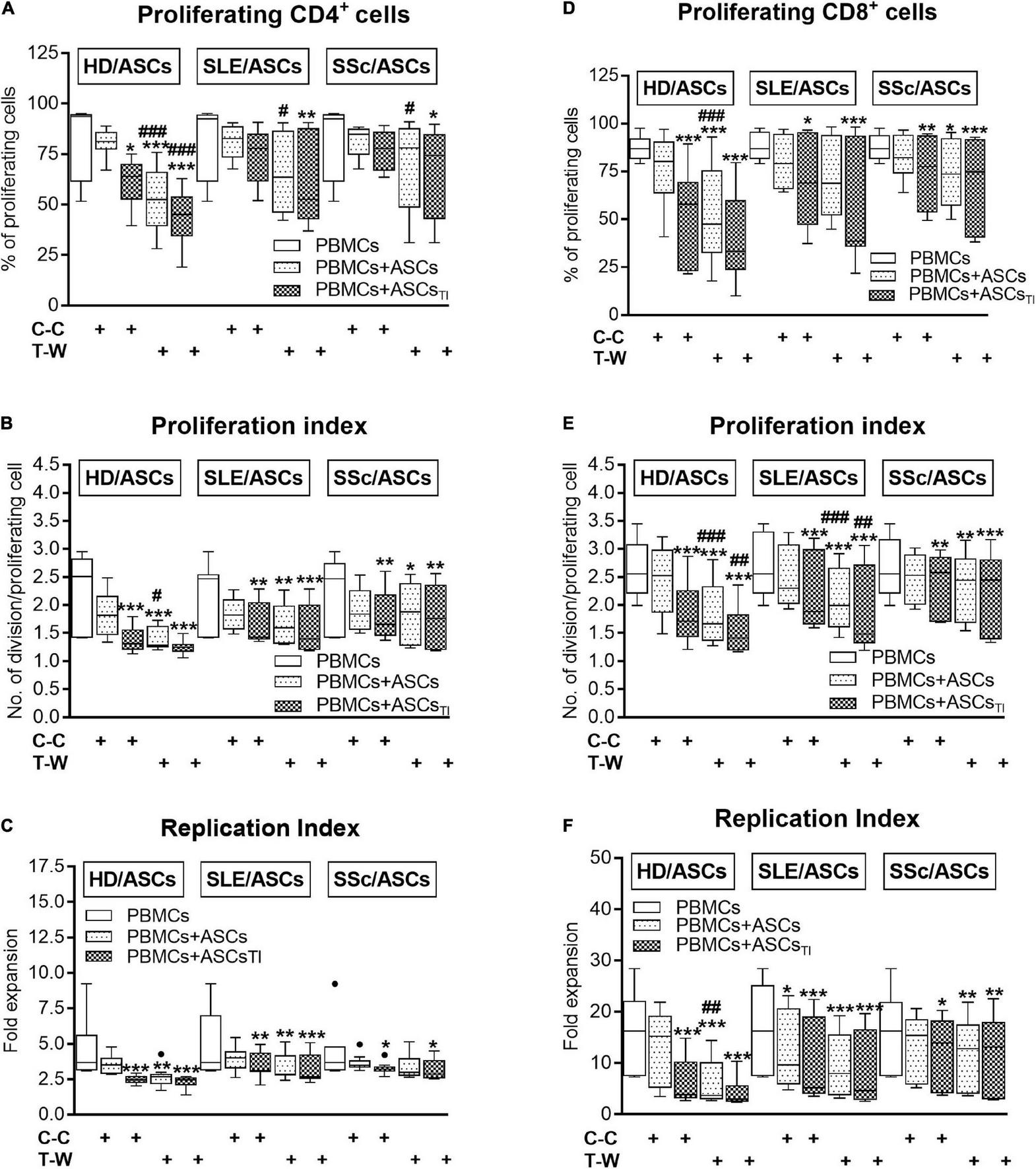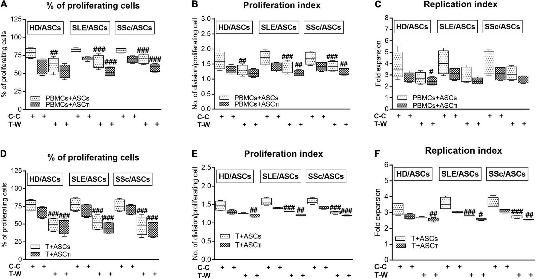 Comparison of ASCs inhibitory effects on CD4+ T-cell proliferation in cell contact and transwell co-cultures with PBMCs and purified CD4+ T cells isolated from the same healthy volunteers. Data are shown as the Tukey’s boxes and are results of 4 experiments in which 2 HD/ASCs, 2 SLE/ASCs, and 2 SSc/ASCs lines were co-cultured with PBMCs (A–C) or purified CD4+ T cells (D–F) isolated from the peripheral blood of 2 same healthy blood volunteers. Both PBMCs and purified CD4+ T cells were stimulated with PHA. #P < 0.05, ##P < 0.01, and ###P < 0.001 for comparison of C-C versus T-W co-cultures. Other explanations as in Figure 3.