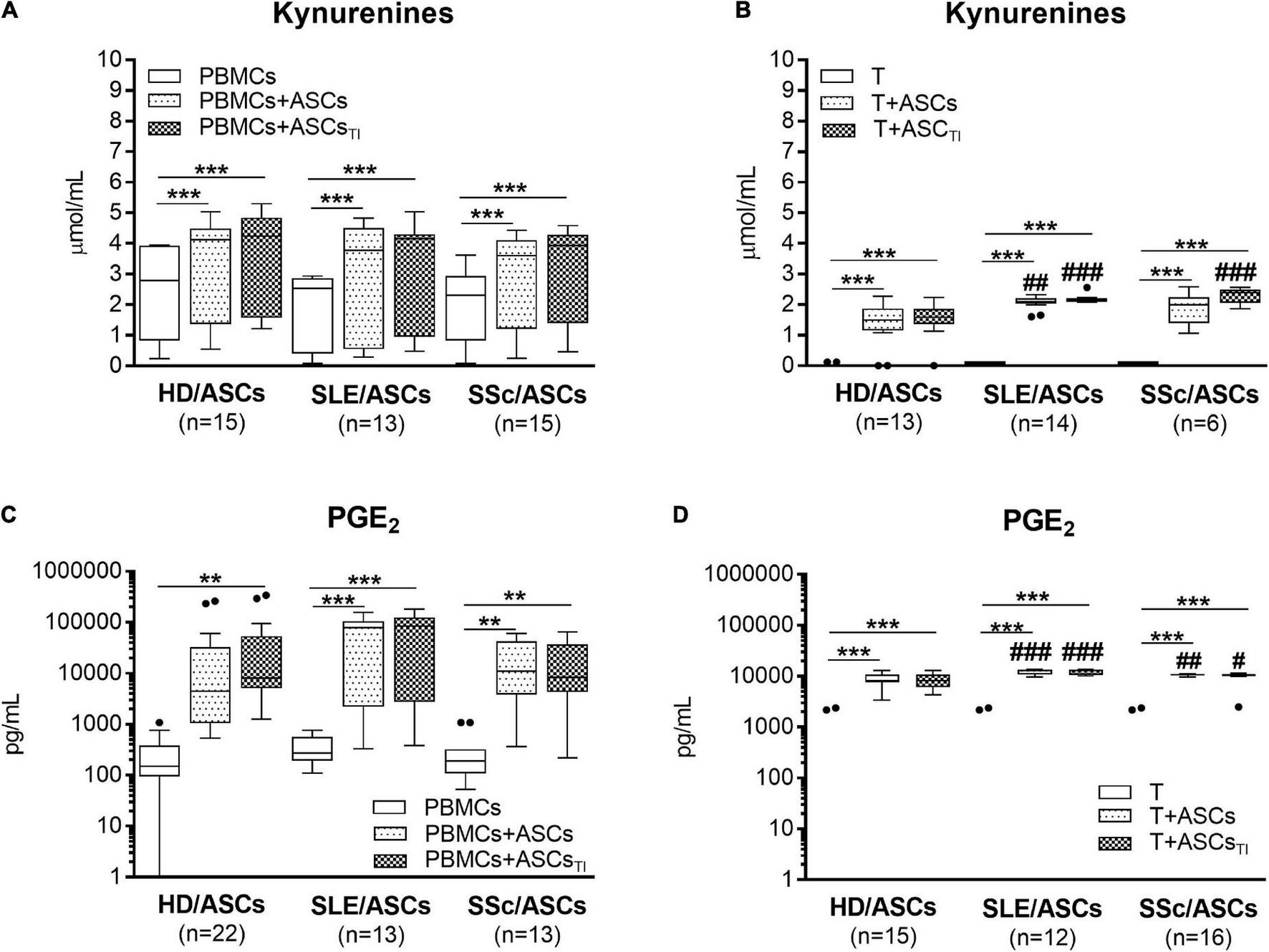 Upregulation of kynurenines and PGE2 synthesis in the co-cultures of ASCs with activated target cells. (A,C) PBMCs obtained from 13 healthy blood volunteers were stimulated with PHA and co-cultured in the same conditions as in Figure 1 with 5 HD/ASCs, 11 (A) or 7 (C) SLE/ASCs, and 10 (A) or 9 (C) SSc/ASCs. B,D: CD4+ T cells were purified from 12 healthy blood volunteers, stimulated with anti-CD3/anti-CD28 antibodies and co-cultured in the same conditions as in Figure 2 with 5 HD/ASCs, 8 (B) or 6 (D) SLE/ASCs, and 6 (B) or 8 (D) SSc/ASCs. The concentrations of kynurenines and PGE2 were measured in culture supernatants as described in the section “Materials and Methods.” Data are the results of the indicated number of experiments (n) and are shown as the Tukey’s boxes. *P < 0.05, **P < 0.01, ***P < 0.001 for comparisons of cell co-cultures versus separate control cultures; #P < 0.05, ##P < 0.01, ###P < 0.001 for the groups of patients versus HD comparison. Other explanations as in Figures 1, 2.