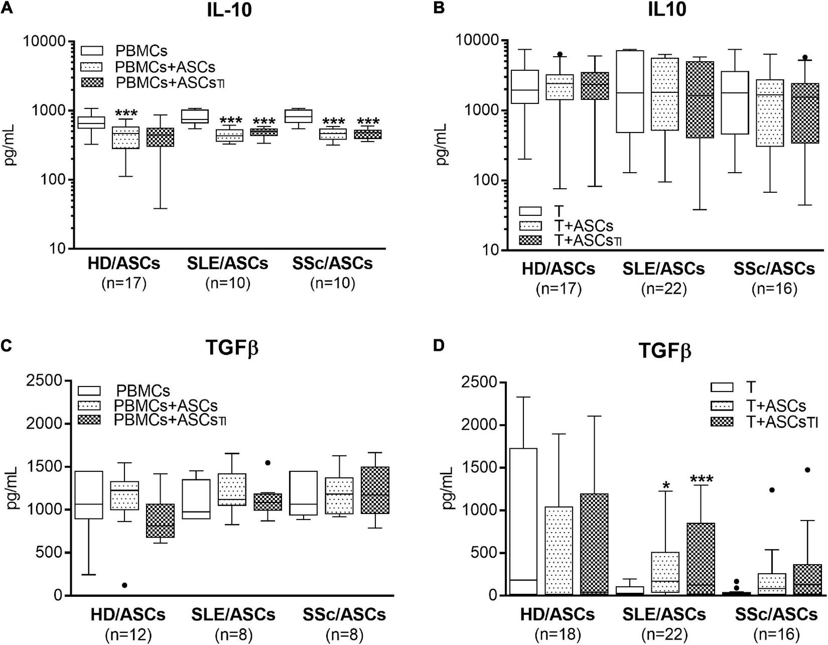 Concentrations of anti-inflammatory cytokines in the co-cultures of ASCs with activated target cells. (A,C) PBMCs obtained from 12 healthy blood volunteers were stimulated with PHA and co-cultured in the same conditions as in Figure 1 with 5 HD/ASCs, 9 (A) or 5 (C) SLE/ASCs, and 9 (A) or 5 (C) SSc/ASCs. (B,D) CD4+ T cells were purified from 9 healthy blood volunteers, stimulated with anti-CD3/anti-CD28 antibodies and co-cultured in the same conditions as in Figure 2 with 5 HD/ASCs, 11 (B) or 10 (D) SLE/ASCs, and 8 (B) or 9 (D) SSc/ASCs. The concentrations of TGFβ and IL-10 were measured in culture supernatants as described in the section “Materials and Methods.” Data are the results of the indicated number of experiments (n) and are shown as the Tukey’s boxes. *P < 0.05, **P < 0.01, ***P < 0.001 for comparisons of cell co-cultures versus separate control cultures. There were no statistically significant differences between co-cultures containing HD/ASCs versus ASCs of SLE and SSc patients. Other explanations as in Figures 1, 2.