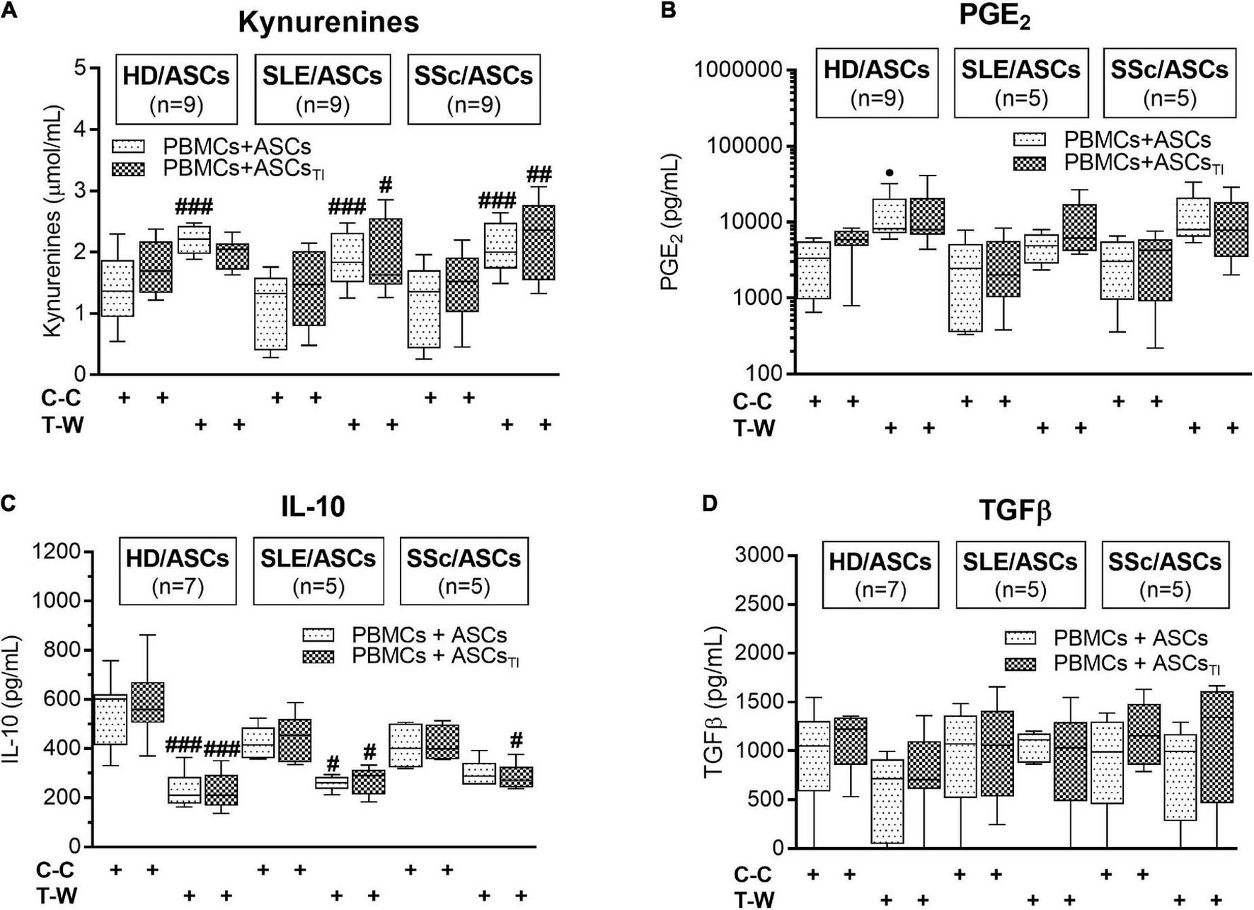 Concentrations of soluble mediators in cell contact and transwell co-cultures of ASCs with PBMCs: (A) Kynurenines, (B) PGE2, (C) IL-10, (D) TGFβ. The culture conditions and explanations as in Figure 3. Data are the results of indicated number of experiments (n) in which 5 HD/ASCs, 5 SLE/ASCs, and 5 SSc/ASCs were co-cultured with PBMCs isolated from 9 healthy blood volunteers and are shown as the Tukey’s boxes. #P < 0.05, ##P < 0.01, and ###P < 0.001 for comparison of cell contact (C-C) vs. transwell (T-W) co-cultures.