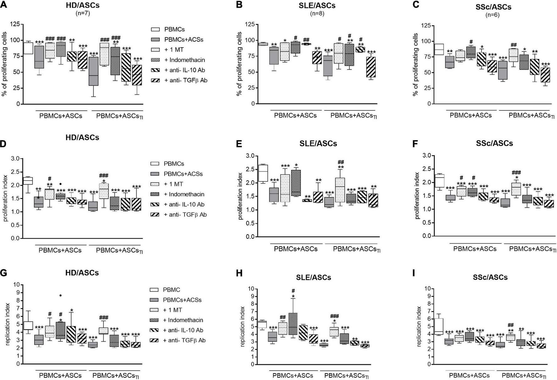 Selective inhibitors of kynurenines (1-MT) and PGE2 (indomethacin) synthesis counteract anti-proliferative impact of ASCs on CD4+ T-cells, while cytokine neutralization has negligible effect. Cell preparation and culture conditions as in Figure 1. Proliferation of CD4+ T-cells from PBMCs co-cultured with ASCs obtained from HD (A,D,G), SLE (B,E,H) SSc (C,F,I) patients. The concentrations and time of cell treatment with 1-MT, indomethacin, and cytokine specific neutralizing antibodies are described in Materials and Methods. Data, shown as the Tukey’s boxes, are the results of indicated number of experiments (n) in which PBMCs obtained from 7 healthy blood volunteers were co-cultured with 3 HD/ASCs, 4 SLE/ASCs, and 5 SSc/ASCs. *P < 0.05, **P < 0.01, ***P < 0.001 for comparisons of cell co-cultures vs separate control cultures; #P < 0.05, ##P < 0.01, ###P < 0.001 for comparison of inhibitor treated vs. untreated co-cultures. Other explanations as in Figure 1.