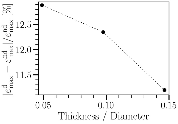 Relative change in radial strain of a straight tube between non-degraded (εnd) and degraded (εd) cases vs. wall thickness of the tube. The tube diameter is 0.41 cm. The wall thickness varies from 0.02 cm to 0.06 cm. The imposed cyclic load ranges from 8.7 kPa to 20 kPa, having the same waveform as shown in Figure 1A. Each simulation runs for five cycles. T = 0.8 s; γ∞ = 18 kPa. Other material parameters are given in Table 1.