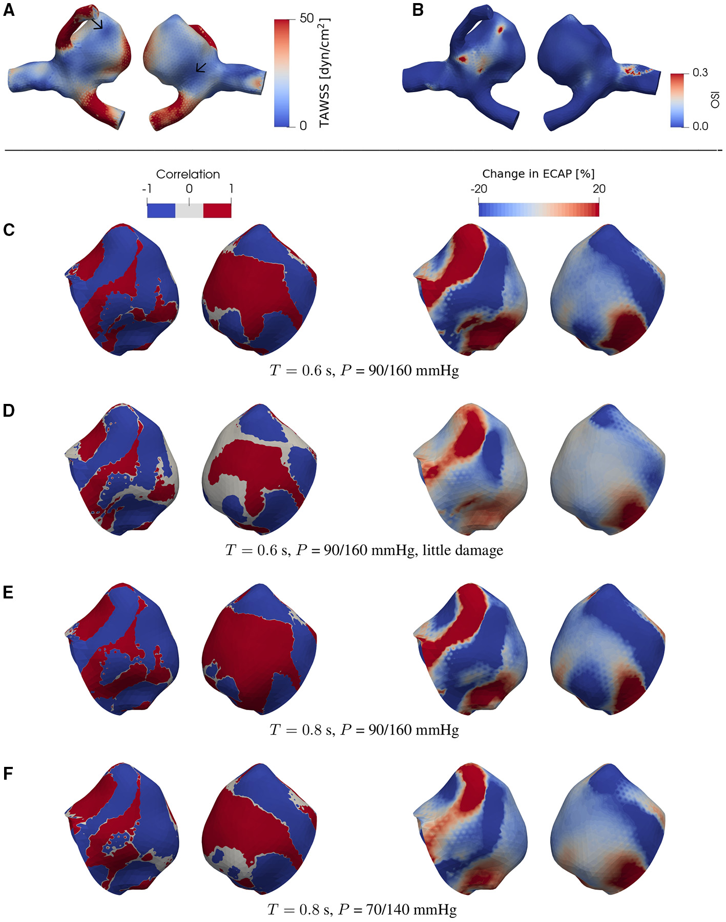 (A) TAWSS and (B) OSI field in the presence of degradation using a patient-specific aneurysm geometry [C0034 in Aneurisk dataset repository (Aneurisk-Team, 2012); Figure 1C]. (C–F) Product of degradation-induced relative changes in TAWSS and OSI (two left-hand columns; Equation 5) and the relative change in ECAP (two right-hand columns; Equation 4) under different damage intensities and flow conditions. The damage intensity in (C) is larger than that in (D). (C,E) differ in only the heart rate (or duration of cardiac cycle T). Compared to (E), the pressure P in (F) is lower. In (C–F), all negative and positive products (threshold = ∓5%) of the relative changes in TAWSS and OSI are set to –1 and 1, respectively. As indicated by comparisons between (A) and (C–F), the degradation-enhanced inverse correlation between TAWSS and OSI remains intact particularly at regions with low WSS. For each case investigated, the locations of low-WSS (indicated by arrows) remain intact during a full cardiac cycle. The second (fourth) column shows the same simulated data as in the first (third) column but after rotating the aneurysm dome by an angle of π around the polar axis. In (C–F) we show only the aneurysm region since the degradation model is applied only on the aneurysm domain.