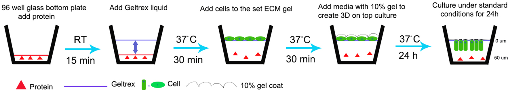 Schematic representation of modified 3D-on-top culture method (side view). Red triangle represents proteins-test (AMEL, AMBN, AMBN 17kDa, AMBN ∆5) and control (BSA, heat denatured AMBN). Green oval and rectangle represent HAT-7 cells. Solid line- GFR Geltrex after polymerization and scalloped line denotes 10% gel overlaid on cells. 0 and 50um markings are used to indicate the Z position on the surface (0 um) and within the gel (50 um) after 24 h resulting in elongation of the cells as shown in Figures 2D,E and Figure 4.