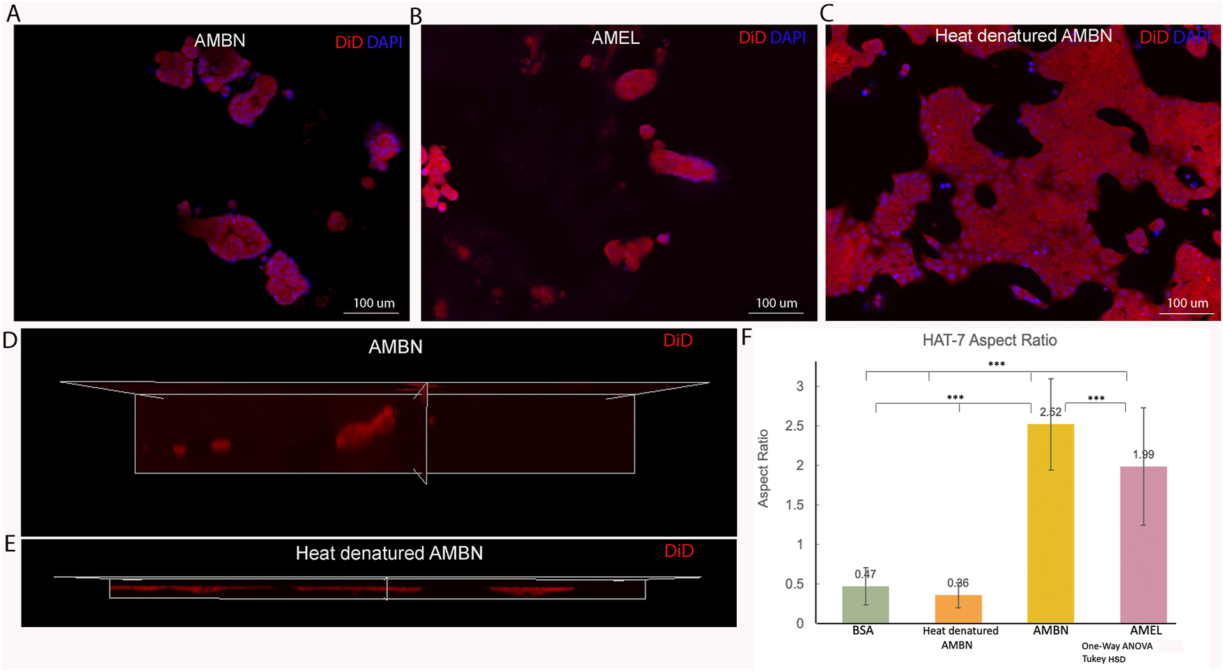 HAT-7 cells in modified 3D-on-top culture using growth-factor reduced Geltrex; 24h. (A–C). 2D surface images (top view, XY plane) of HAT-7 cells in the presence of AMBN, AMEL and heat denatured AMBN (negative control) respectively. Cell membrane labeled with DiD (red) and nucleus with DAPI (blue). HAT-7 cells organize into distinct cell clusters in (A) and (B) unlike in the control (C) where the cells are spread along the XY plane. (D, E). 3D reconstruction and axial view (side view, XZ plane) of representative samples from AMBN and heat denatured AMBN groups respectively. Cell outline as visualized by DiD reveals elongated, tall cells in (D) unlike the planar, flat cells with (E). (F) Aspect ratio measurements of HAT-7 cells from test and control groups. HAT-7 cells are statistically significantly elongated in the presence of AMEL and AMBN. *p < 0.05; **p < 0.01; ***p < 0.001.