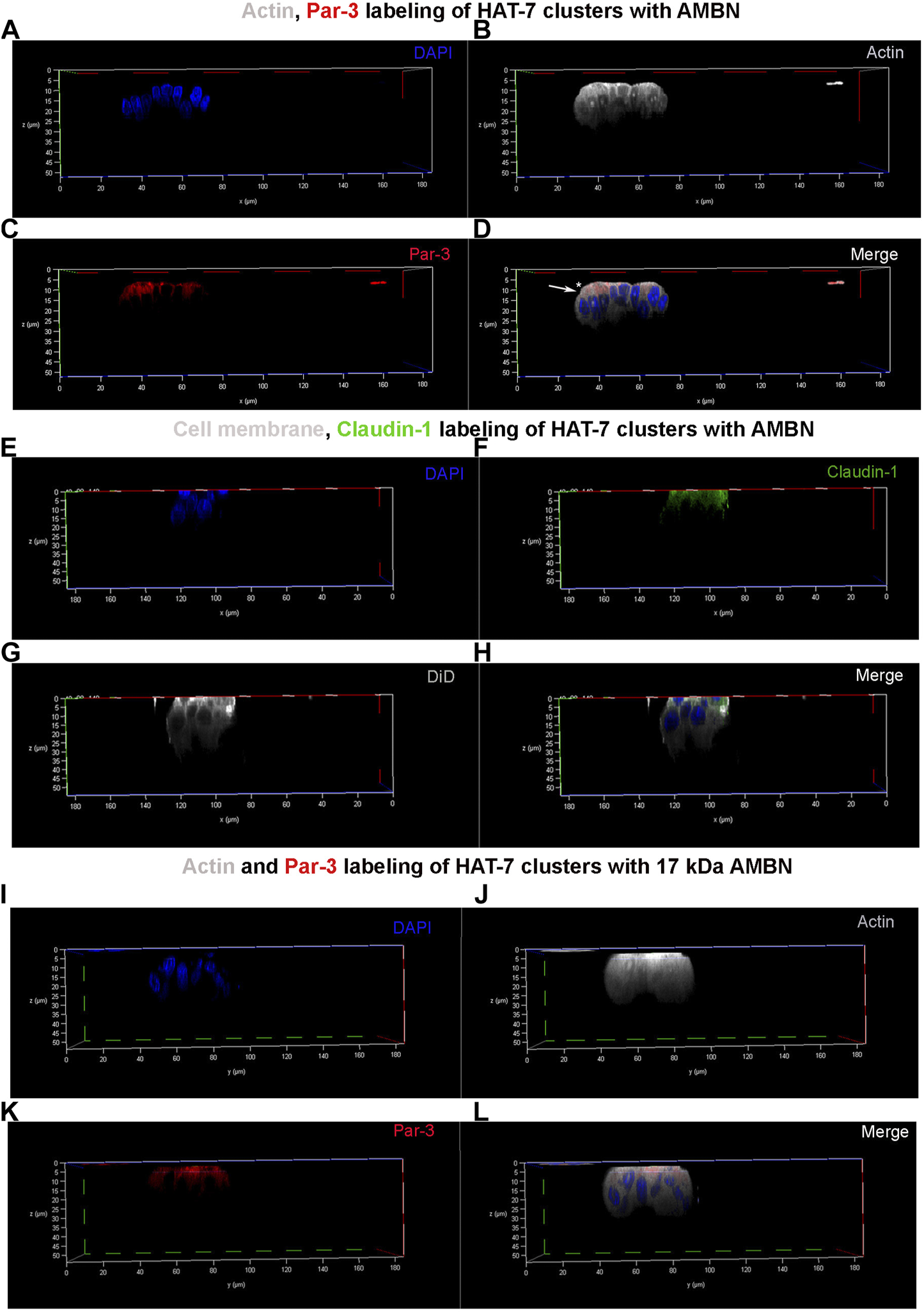 Par-3 and Claudin-1 polarization in HAT-7 clusters in a 3D axial view. (A–C) Individual channels for nucleus (DAPI), actin (grey pseudo color) and Par-3 (red) distribution respectively in HAT-7 cells cultured with AMBN. (D) Merged image of all three channels revealing a uniform symmetrical labeling of actin with an asymmetrical and polarized distribution of Par-3 (white arrow). (E–G) Individual channels for nucleus (blue), claudin-1 (green) and DiD (grey pseudo color) respectively in HAT-7 cells cultured with ameloblastin. (H) Merged images of all three channels revealing selective claudin-1 labeling within the pole of the cells basal to nucleus. DiD labeling is uniform throughout the entire outline of the cells. (I–K) Individual channels for nucleus (DAPI), actin (grey pseudo color) and Par-3 (red) distribution in HAT-7 cells cultured with AMBN 17 kDa cleavage fragment respectively. (L) Merged image of all three channels revealing a uniform symmetrical labeling of actin with an asymmetrical and polarized distribution of Par-3 like the observations in (D).