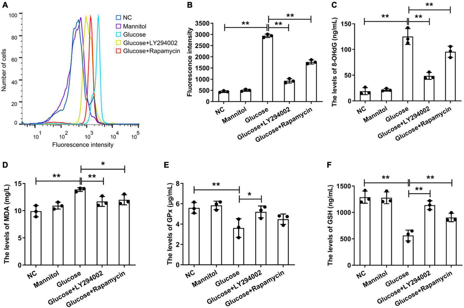Under the stimulation of high glucose and inflammation, a large amount of ROS is produced in rat PMCs, which is the main reason for accelerating cell senescence and apoptosis (Wu et al., 2016). We focussed on the function of LY294002 and rapamycin in the ROS signalling pathways. We performed flow cytometry to analyse the generation of intracellular ROS, and the results showed that the ROS level was significantly increased in the HG group compared with the negative control (NC) group (P < 0.01), but it was significantly reduced in the HG + LY294002/rapamycin groups compared with the HG group (P < 0.01) (Figures 1A,B). Thus, both LY294002 and rapamycin blocked ROS generation. Additionally, the levels of the DNA oxidative damage marker 8-OHdG in the HG + LY294002/rapamycin groups were significantly decreased compared with the HG group (P < 0.01) (Figure 1C). The malondialdehyde (MDA) content was also revealed significantly decreasing in the HG + LY294002/rapamycin groups compared with the HG group (Figure 1D). Moreover, the expression of glutathione peroxidase (GPX) and glutathione (GSH) were both significantly downregulated in HG groups compared to the NC (P < 0.01) (Figures 1E,F). LY294002 and rapamycin increased the expressions of GSH significantly in HG + LY294002/rapamycin groups (P < 0.01) (Figure 1F). The expression of GPX exhibited similar situations in HG + LY294002/rapamycin groups (Figure 1E). Thus, LY294002 and rapamycin increased the activities of GPX and GSH in HG-induced PMCs.