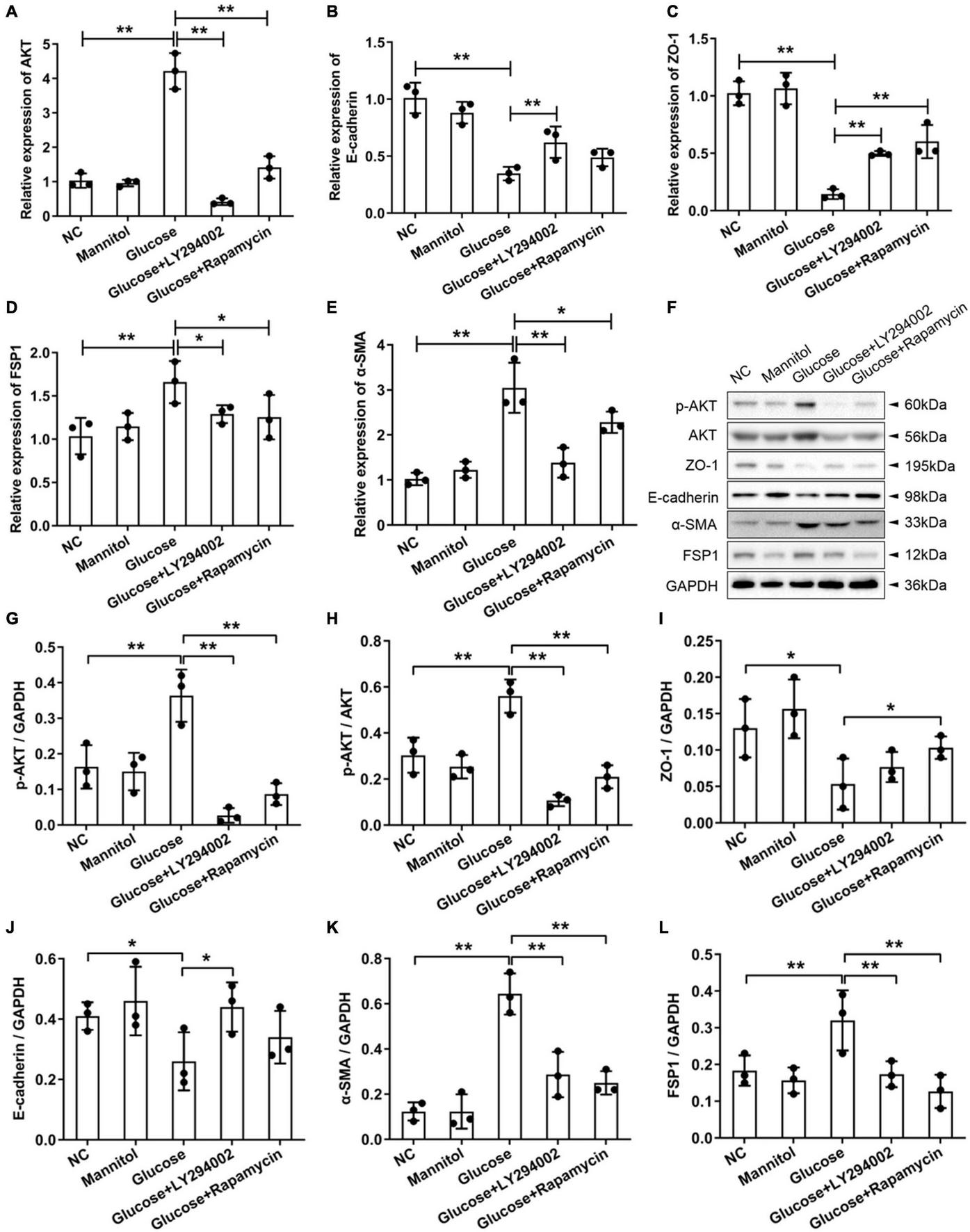 To examine the effects of LY294002 and rapamycin on the epithelial mesenchymal transdifferentiation markers ZO-1 and E-cadherin and the fibroblast-specific markers FSP1 and α-SMA, we performed qRT-PCR and western blot analysis of rat PMCs. The qRT-PCR results showed that the expression of AKT, FSP1, and α-SMA increased sharply and significantly in the HG groups compared with the NC groups or mannitol groups (P < 0.01) (Figures 2A,D,E). The AKT and α-SMA expressions decreased significantly after the addition of LY294002 or rapamycin to the HG solutions (P < 0.01, P < 0.05) (Figures 2A,E). And the FSP1 expressions were obviously reduced in HG + LY294002/rapamycin groups (Figure 2D). The expression of ZO-1 and E-cadherin revealed opposite results that they were both decreased significantly in the HG group (P < 0.01) compared to the NC and increased significantly in the HG + LY294002/rapamycin groups compared to the HG group (P < 0.01) (Figures 2B,C). Western blot analysis showed that the FSP1 and α-SMA protein levels increased significantly with HG treatment and decreased obviously after LY294002 or rapamycin supplementation in the HG solutions (P < 0.01) (Figures 2F,J,K). Furthermore, ZO-1 and E-cadherin protein levels decreased significantly under HG treatment and increased after LY294002 or rapamycin was added to the HG solution (Figures 2F,H,I). The AKT proteins revealed obvious increasing under HG conditions and decreasing with LY294002 or rapamycin supplementation (Figure 2F). The p-AKT protein expression showed similar variation trend with AKT when normalised to GAPDH or AKT (P < 0.01) (Figures 2F,G,L). These confirmed the qRT-PCR results.