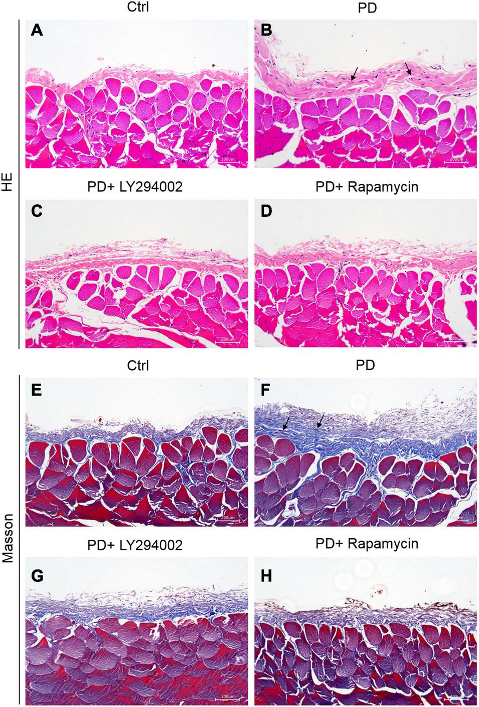 The intervention effect of the high glucose-induced PD model was evaluated by observing the degree of cell infiltration and fibrosis. The results of haematoxylin-eosin (HE) staining showed that the peritoneal tissue of the control group was smooth and thin. The peritoneum was covered with a thin layer of mesothelial cells connected with connective tissues. There was no obvious accumulation of collagen fibres under the mesothelial cells and no obvious infiltration of inflammatory cells. Compared with that of the control group, the peritoneal tissue of the PD group was significantly thickened, the mesothelial cells fell off, collagen fibres accumulated significantly under the mesothelial cells, and there was obvious inflammatory cell infiltration (Figures 3A,B). Masson staining showed that a small amount of collagen fibres accumulated under the mesothelial tissue of the control group rats, and there were fewer blue collagen fibres, while the peritoneal tissues of rats in the PD group obviously accumulated a large amount of collagen, the coloured collagen fibres were more density, and vascular hyperplasia was obvious (Figures 3E,F). The PD rats treated with LY294002 or rapamycin showed obviously symptom alleviation compared to the PD group (Figures 3C,D,G,H).