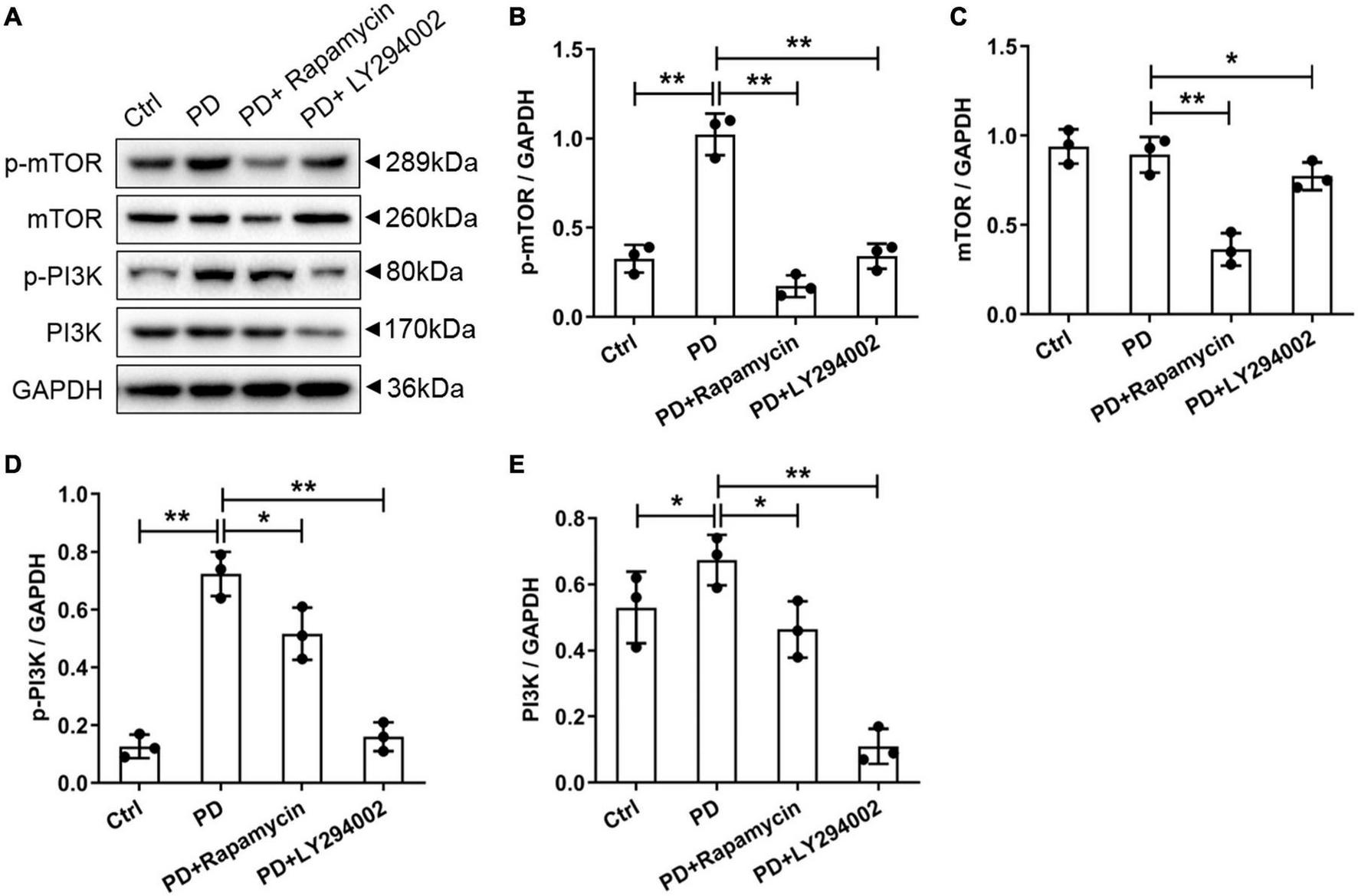 To further investigate the relationship between fibrosis and the PI3K/AKT/mTOR signalling pathway in the peritoneum, we performed a western blot analysis of the PD rats to examine the effects of LY294002 and rapamycin on the expression the classical factors in the PI3K/AKT/mTOR signalling pathway: PI3K and mTOR. Western blot analysis showed significantly increased levels of the p-mTOR, mTOR, p-PI3K, and PI3K proteins in PD rats and significantly decreased levels after LY294002 or rapamycin stimulation (Figures 4A–E). Furthermore, immunohistochemistry was performed to assess the expression of ZO-1, E-cadherin, FSP1, and α-SMA in PD rats that were intraperitoneally administered LY294002 or rapamycin. α-SMA-positive cells (Figures 5A–D) and FSP1-positive cells (Figures 5E–H) were mainly observed in PD rats, and α-SMA and FSP1 immunostaining seemed to be increased in the peritoneum of PD rats (P < 0.01) and decreased in PD rats treated with LY294002 or rapamycin (P < 0.01, P < 0.05) (Figures 5Q,R). However, the expressions of E-cadherin (Figures 5I–L) and ZO-1 (Figures 5M–P) were lower in PD rats than in the control rats (P < 0.01) and higher in PD rats treated with LY294002 or rapamycin compared with the PD rats (P < 0.01, P < 0.05) (Figures 5S,T). Taken together, rapamycin and LY294002 inhibited the phosphorylation of PI3K/mTOR proteins to activate autophagy in PD rats. The qRT-PCR results from the PD group and PD rats treated with LY294002 or rapamycin confirmed the immunohistochemistry results in further (Figures 5U–X).