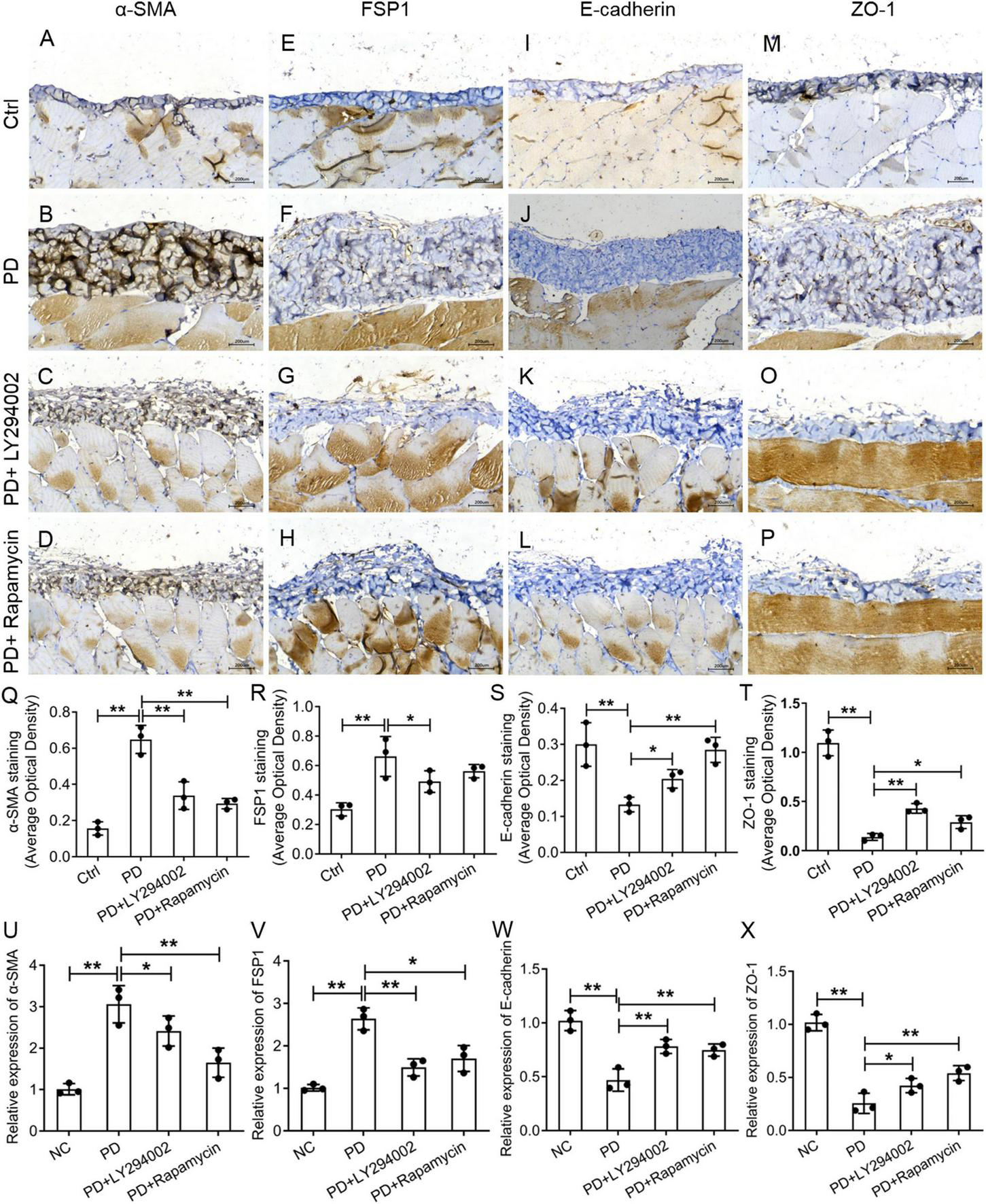 Effects of LY294002 and rapamycin on HG-induced peritoneal fibrosis in rats. The expression of α-SMA (A–D), FSP1 (E–H), E-cadherin (I–L) and ZO-1 (M–P) in the peritoneum of control rats, PD rats and PD rats treated with LY294002 or rapamycin was determined by IHC assay. Three rats in each group were prepared. (Q–T) Quantitative analysis of the average optical density of α-SMA, FSP1, E-cadherin and ZO-1 in the IHC assay. (U–X) The qRT-PCR results showed the expression of α-SMA, FSP1, E-cadherin, and ZO-1 in the HG group, the HG + LY294002 or rapamycin group, and the NC group. Columns represent the means (n ≥ 3); bars represent the SD; *p < 0.05, **p < 0.01.