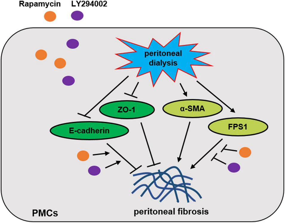 Proposed scheme for the mechanism by which Rapamycin and LY294002 obstructs peritoneal fibrosis in vivo and in vitro.