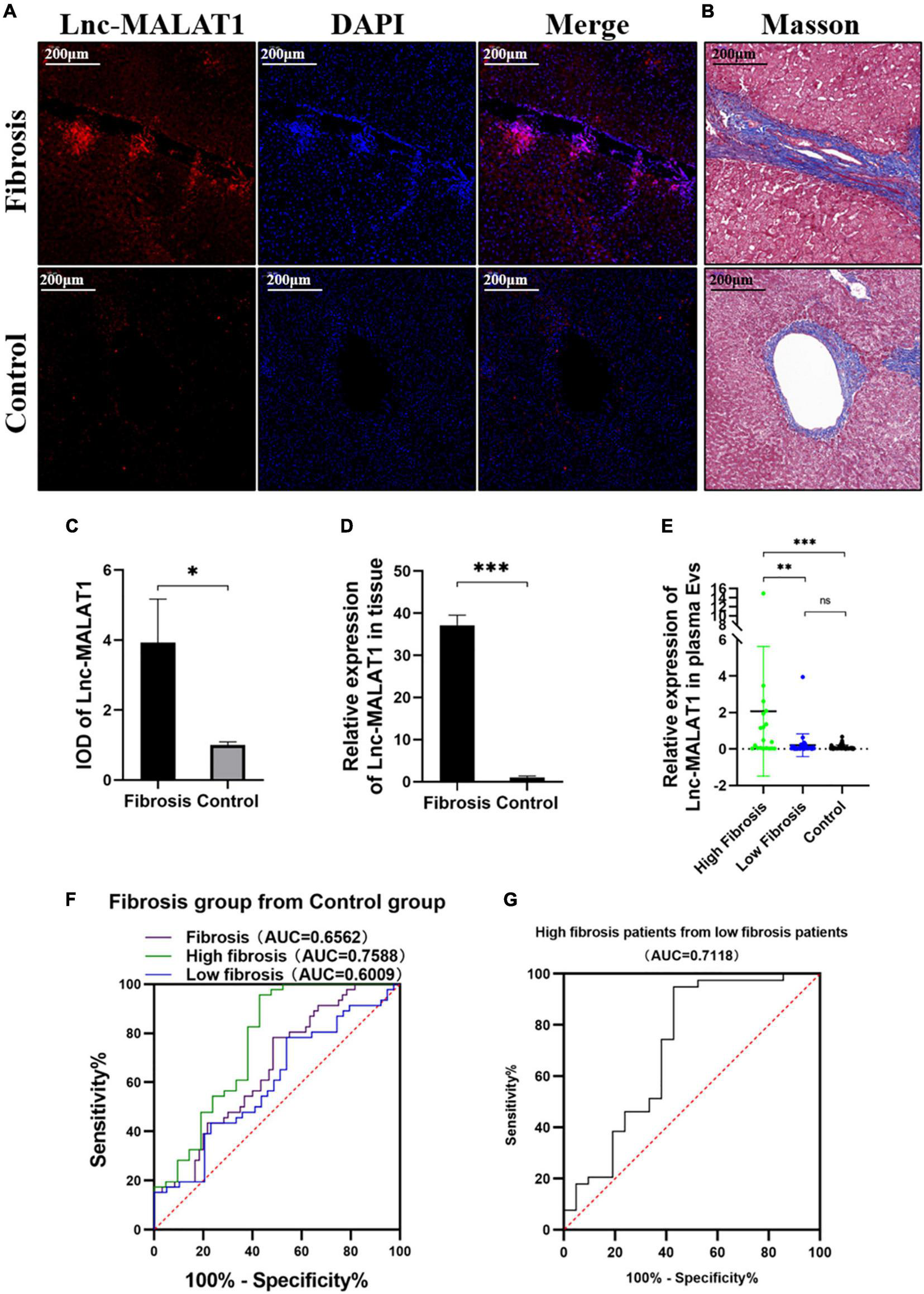 Expression of Lnc-MALAT1 in the fibrotic liver tissues and plasma EVs-Lnc-MALAT1 as a potential diagnostic marker. (A) Representative image of fluorescence in situ hybridization (FISH) targeting Lnc-MALAT1 in the liver specimens from the high fibrosis group and the control group; (B) Representative image of Masson staining in the consecutive tissue slides. (C) Relative integral optical density (IOD) value of Lnc-MALAT1 measured by Image-pro plus (n = 6 in each group. (D) Levels of Lnc-MALAT1 in the liver tissues determined by qRT-PCR (n = 6 in each group). (E) Scatter plot of the Lnc-MALAT1 expression in plasma EVs derived from the high fibrosis group (n = 21), low fibrosis group (n = 39) and control group (n = 46). (F) ROC analysis of the EVs-Lnc-MALAT1 level as a diagnostic marker for liver fibrosis. (G) ROC analysis of the EVs-Lnc-MALAT1 level for discrimination of high fibrosis from low fibrosis. *, **, and *** represent p-values less than 0.05, 0.01, and 0.001, respectively.
